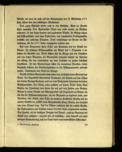 Durch die kleine Parterretür links neben dem Orchester betrat Friedrich den Saal. Im Augenblick schmetterten Trompeter und Pauker aus den Höhen des dritten Ranges Fanfaren, und vor dem Proszenium salutierten die beiden Riesengardisten. Der König nahm grüßend auf seinem Sessel Platz, Graf Götter, der Intendant, trat hinter rhn und gab das Zeichen zum Anfang. Graun in rotem Mantel mit Allongeperücke saß dirigierend am Flügel, um ihn her die Jnstrumentengruppe, die die Rezitative zu begleiten hatte, zwei Theorben, eine Harfe, zwei Celli, im weiteren Halbkreise schlossen sich die andern Musiker an, geführt vom Konzertmeister Franz Benda, der ebenfalls den roten Mantel trug. Auf der Bühne entfaltete sich die reichste Pracht; für Dekorationen und Kostüme waren 210000 Taler aufgewendet worden. Die Zweifel, ob die sonstigen Vorzüge des Baues „auch zur Avantage der Musik seyn möchten", erwiesen sich als hinfällig; „man bemerkt mit nicht geringer Bewunderung, daß die Musik darin einen vortrefflichen Effect thut".