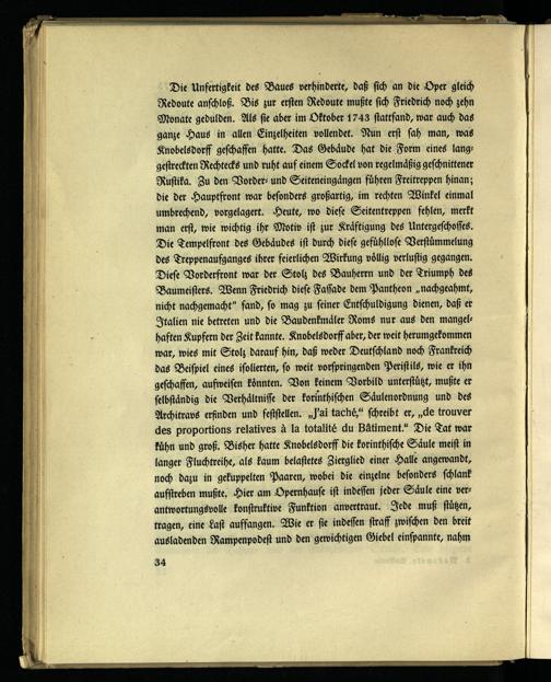 Die Unfertigkeit des Baues verhinderte, daß sich an die Oper gleich Redoute anschloß. Bis zur ersten Redoute mußte sich Friedrich noch zehn Monate gedulden. Als sie aber im Oktober 1743 stattfand, war auch das ganze Haus in allen Einzelheiten vollendet. Nun erst sah man, was Knobelsdorff geschaffen hatte. Das Gebäude hat die Form eines langgestreckten Rechtecks und ruht auf einem Sockel von regelmäßig geschnittener Rustika. Zu den Vorder- und Seiteneingängen führen Freitreppen hinan; die der Hauptfront war besonders großartig, im rechten Winkel einmal umbrechend, vorgelagert. Heute, wo diese Seitentreppen fehlen, merkt man erst, wie wichtig ihr Motiv ist zur Kräftigung des Untergeschosses. Die Tempelfront des Gebäudes ist durch diese gefühllose Verstümmelung des Treppenaufganges ihrer feierlichen Wirkung völlig verlustig gegangen. Diese Vorderfront war der Stolz des Bauherrn und der Triumph des Baumeisters. Wenn Friedrich diese Fassade dem Pantheon „nachgeahmt, nicht nachgemacht" fand, so mag zu seiner Entschuldigung dienen, daß er Italien nie betreten und die Baudenkmäler Roms nur aus den mangelhaften Kupfern der Zeit kannte. Knobelsdorff aber, der weit herumgekommen war, wies mit Stolz darauf hin, daß weder Deutschland noch Frankreich das Beispiel eines isolierten, so weit vorspringenden Peristils, wie er ihn geschaffen, aufweisen könnten. Von keinem Vorbild unterstützt, mußte er selbständig die Verhältnisse der korinthischen Säulenordnung und des Ärchitravs erfinden und feststellen, ,,J'ai taché," schreibt er, „de trouver des proportions relatives à la totalité du Batiment." Die Tat war kühn und groß. Bisher hatte Knobelsdorff die korinthische Säule meist in langer Fluchtreihe, als kaum belastetes Zierglied einer Halle angewandt, noch dazu in gekuppelten Paaren, wobei die einzelne besonders schlank aufstreben mußte. Hier am Opernhause ist indessen jeder Säule eine verantwortungsvolle konstruktive Funktion anvertraut. Jede muß stützen, tragen, eine Last auffangen. Wie er sie indessen straff zwischen den breit ausladenden Rampenpodest und den gewichtigen Giebel einspannte, nahm