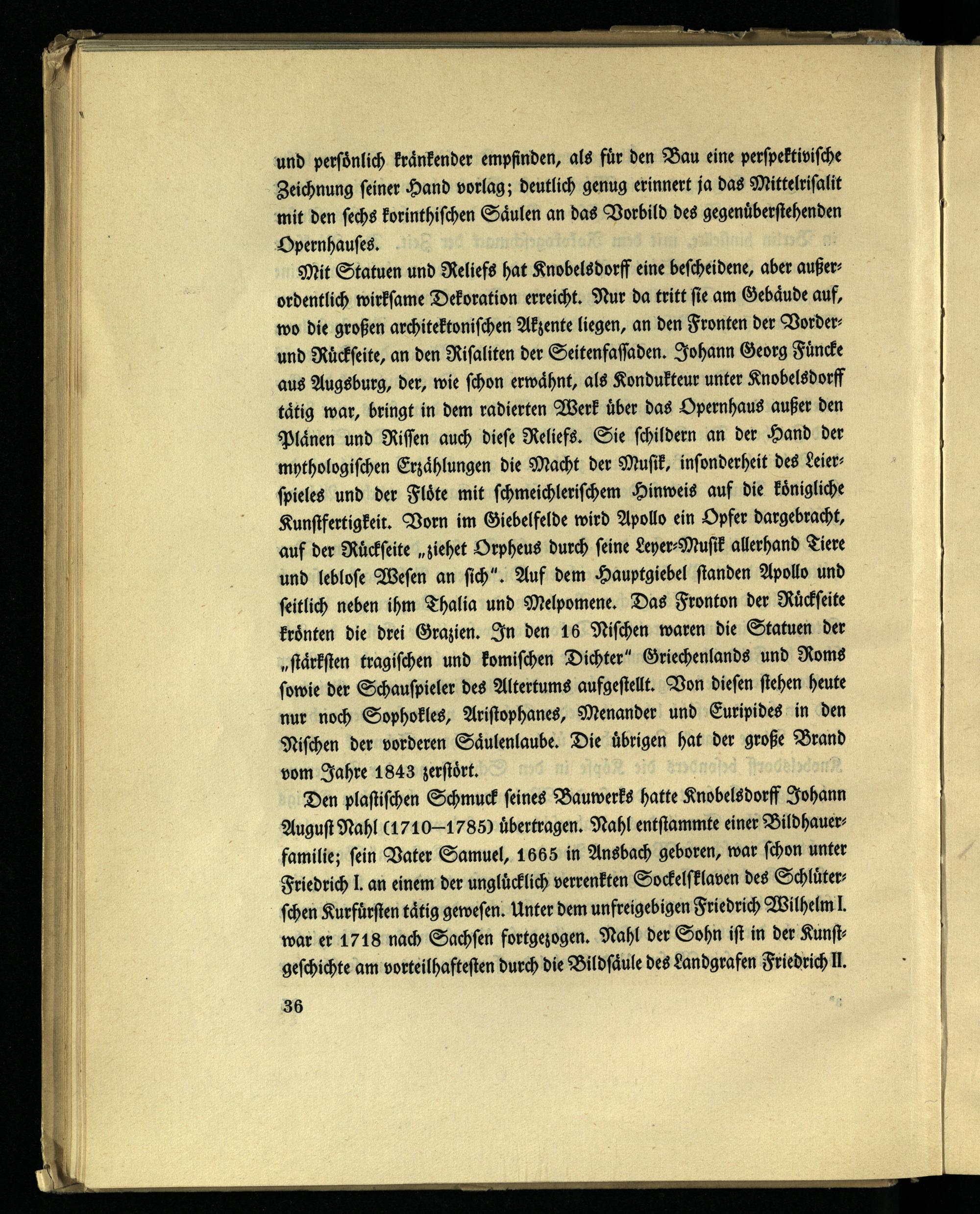 Den plastischen Schmuck seines Bauwerks hatte Knobelsdorff Johann August Nahl ( 1710 - 1785 ) übertragen. Nahl entstammte einer Bildhauer- familie; sein Vater Samuel, 1665 in Ansbach geboren, war schon unter Friedrich l. an einem der unglücklich verrenkten Sockelsklaven des Schlüter- schen Kurfürsten tätig gewesen. Unter dem unfreigebigen Friedrich Wilhelm l. war er 1718 nach Sachsen fortgezogen. Nahl der Sohn ist in der Kunstgeschichte am vorteilhaftesten durch die Bildsäule des Landgrafen Friedrich ll.