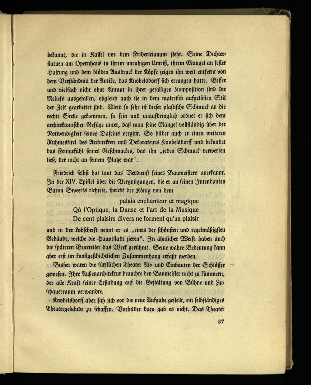bekannt, die in Kassel vor dem Fridericianum steht. Seine Dichterstatuen am Opernhaus in ihrem unruhigen Umriß, ihrem Mangel an fester Haltung und dem blöden Ausdruck der Köpfe zeigen ihn weit entfernt von dem Verständnis der Antike, das Knobelsdorff sich errungen hatte. Besser und vielfach nicht ohne Anmut in ihrer gefälligen Komposition sind die Reliefs ausgefallen, obgleich auch sie in dem malerisch aufgelösten Stil der Zeit gearbeitet sind. Allein so sehr ist dieser plastische Schmuck an die rechte Stelle gekommen, so fein und unaufdringlich ordnet er sich dem architektonischen Gefüge unter, daß man seine Mängel vollständig über der Notwendigkeit seines Daseins vergißt. So bildet auch er einen weiteren Ruhmestitel des Architekten und Dekorateurs Knobelsdorff und bekundet das Feingefühl seines Geschmackes, das ihn „jeden Schmuck verwerfen ließ, der nicht an seinem Platze war".