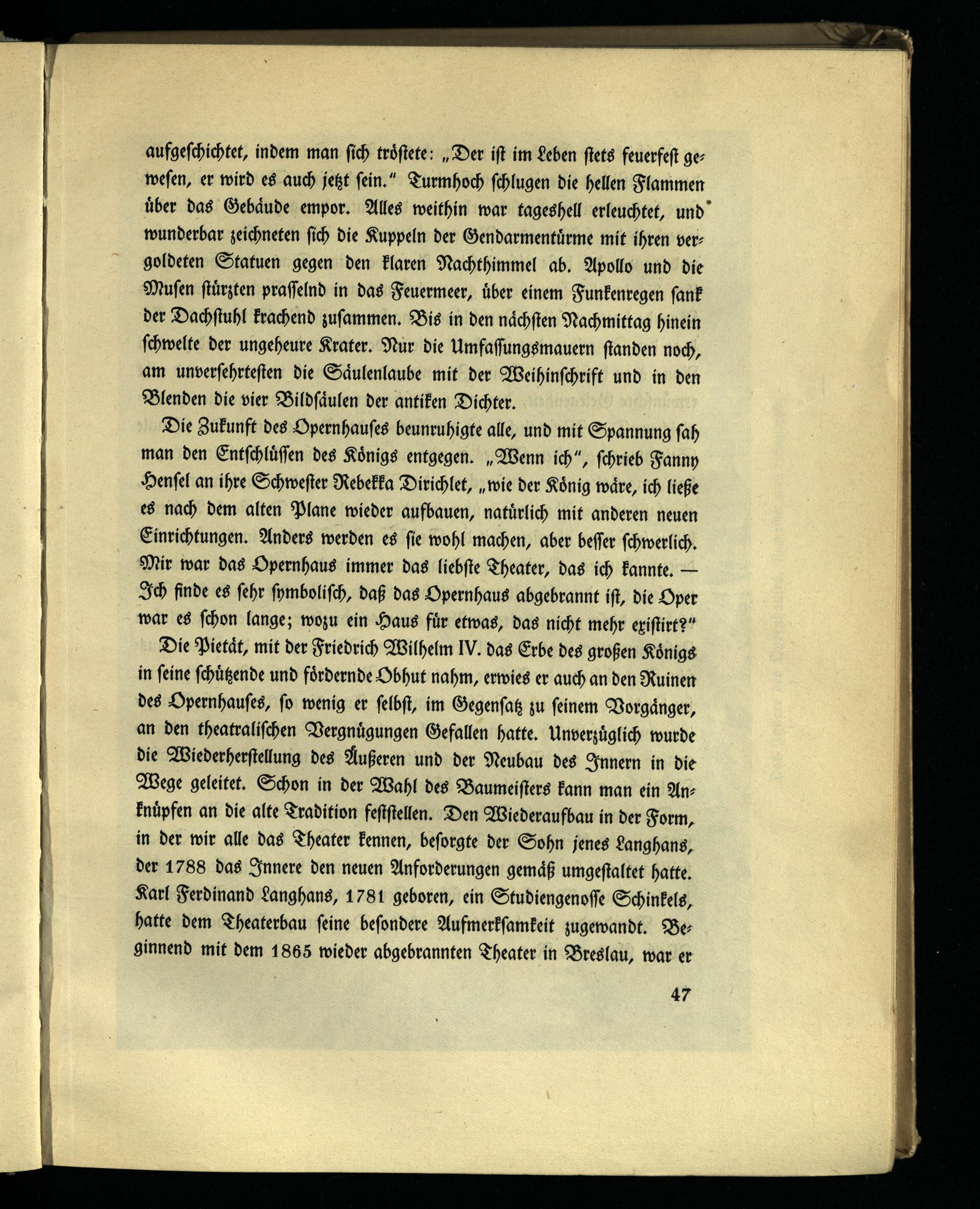 Die Zukunft des Opernhauses beunruhigte alle, und mit Spannung sah man den Entschlüssen des Königs entgegen. „Wenn ich", schrieb Fanny Hensel an ihre Schwester Rebekka Dirichlet, „wie der König wäre, ich ließe es nach dem alten Plane wieder aufbauen, natürlich mit anderen neuen Einrichtungen. Anders werden es sie wohl machen, aber besser schwerlich. Mir war das Opernhaus immer das liebste Theater, das ich kannte. — Ich finde es sehr symbolisch, daß das Opernhaus abgebrannt ist, die Oper war es schon lange; wozu ein Haus für etwas, das nicht mehr existirt?"