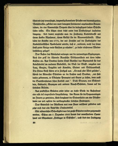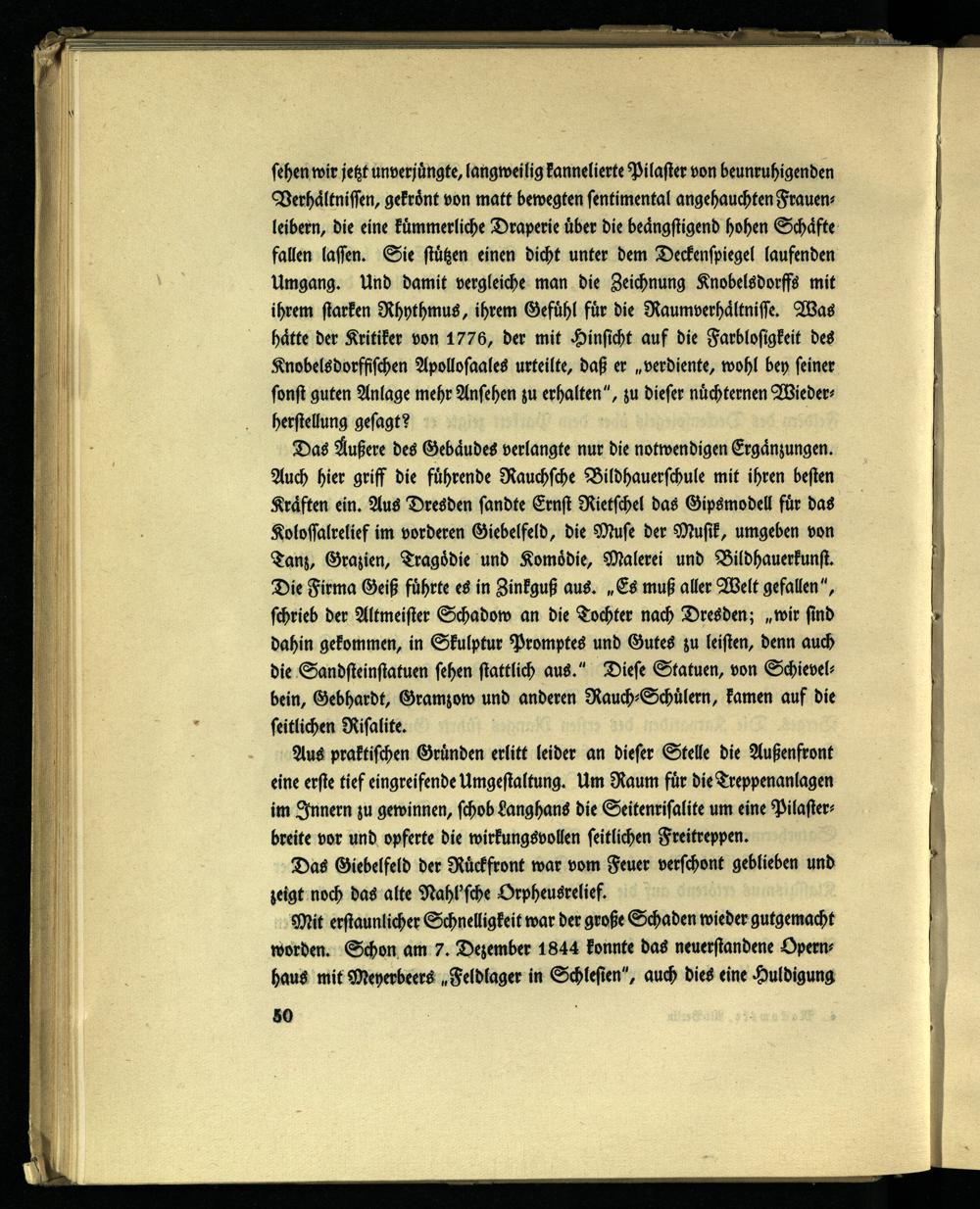 Das Äußere des Gebäudes verlangte nur die notwendigen Ergänzungen. Auch hier griff die führende Rauchsche Bildhauerschule mit ihren besten Kräften ein. Aus Dresden sandte Ernst Rietschel das Gipsmodell für das Kolossalrelief im vorderen Giebelfeld, die Muse der Musik, umgeben von Tanz, Grazien, Tragödie und Komödie, Malerei und Bildhauerkunst. Die Firma Geiß führte es in Zinkguß aus. „Es muß aller Welt gefallen", schrieb der Altmeister Schadow an die Tochter nach Dresden; „wir sind dahin gekommen, in Skulptur Promptes und Gutes zu leisten, denn auch die Sandsteinstatuen sehen stattlich aus." Diese Statuen, von Schievel- bein, Gebhardt, Gramzow und anderen Rauch-Schülern, kamen auf die seitlichen Risalite.