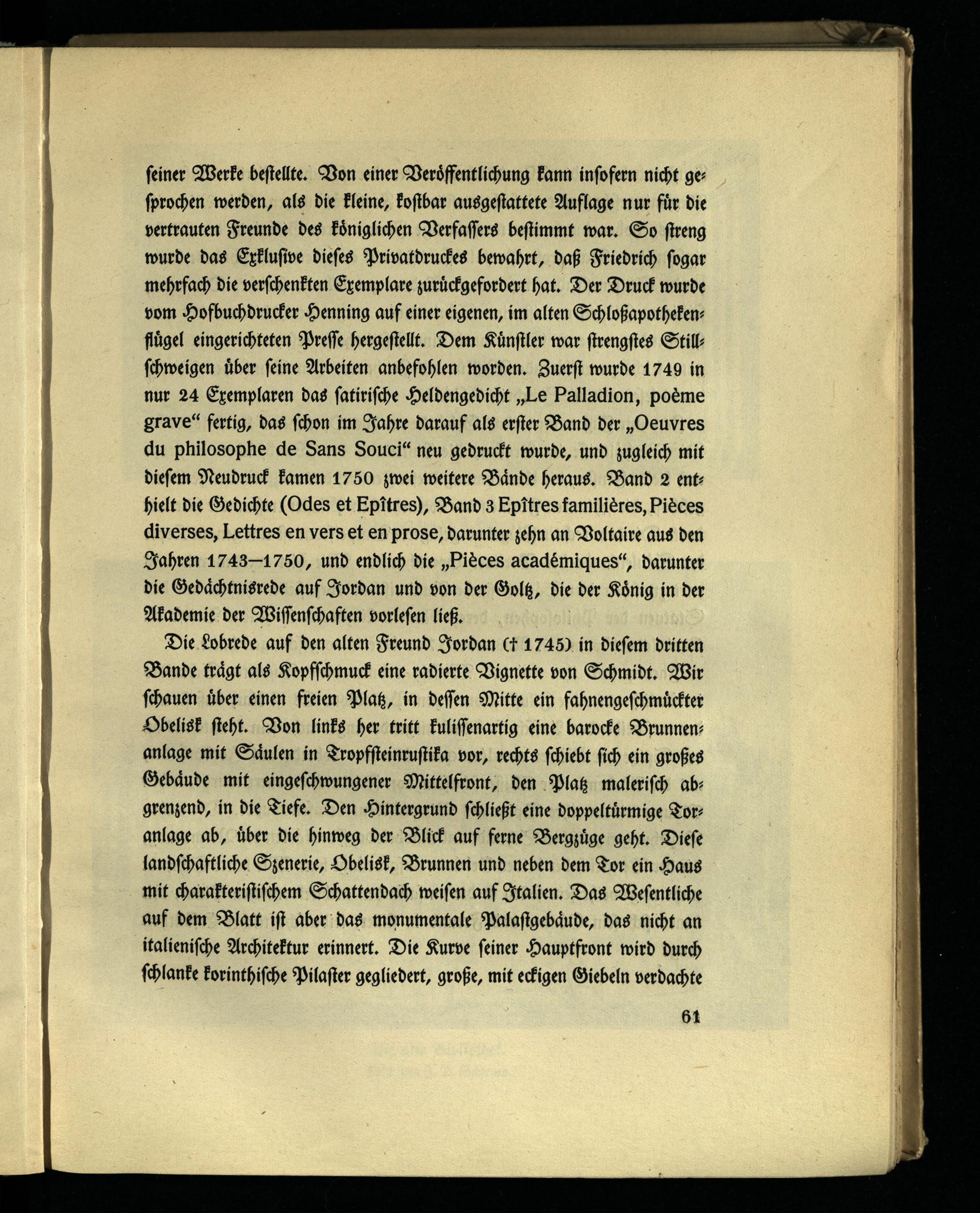 Die Lobrede auf den alten Freund Jordan tt 1745) in diesem dritten Bande trägt als Kopfschmuck eine radierte Vignette von Schmidt. Wir schauen über einen freien Platz, in dessen Mitte ein fahnengeschmückter Obelisk steht. Von links her tritt kulissenartig eine barocke Brunnenanlage mit Säulen in Tropfsteinrustika vor, rechts schiebt sich ein großes Gebäude mit eingeschwungener Mittelfront, den Platz malerisch abgrenzend, in die Tiefe. Den Hintergrund schließt eine doppeltürmige Toranlage ab, über die hinweg der Blick auf ferne Bergzüge geht. Diese landschaftliche Szenerie, Obelisk, Brunnen und neben dem Tor ein Haus mit charakteristischem Schattendach weisen auf Italien. Das Wesentliche auf dem Blatt ist aber das monumentale Palastgebäude, das nicht an italienische Architektur erinnert. Die Kurve seiner Hauptfront wird durch schlanke korinthische Pilaster gegliedert, große, mit eckigen Giebeln verdachte
