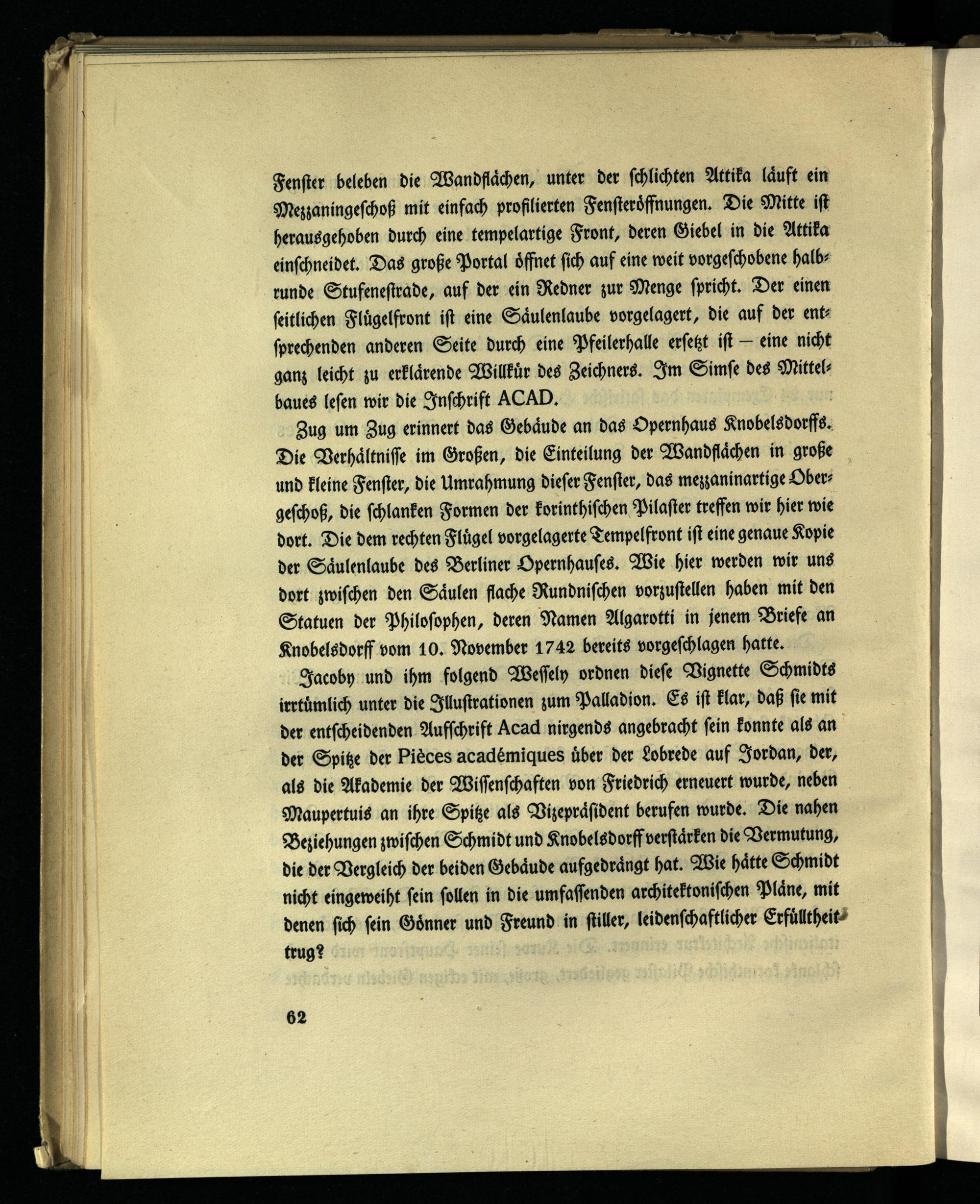 Jacoby und ihm folgend Wessely ordnen diese Vignette Schmidts irrtümlich unter die Illustrationen zum Palladion. Es ist klar, daß sie mit der entscheidenden Aufschrift nirgends angebracht sein konnte als an der Spitze der ?iöce8 ucaäömiqueZ über der Lobrede auf Jordan, der, als die Akademie der Wissenschaften von Friedrich erneuert wurde, neben Maupertuis an ihre Spitze als Vizepräsident berufen wurde. Die nahen Beziehungen zwischen Schmidt und Knobelsdorffverstärken die Vermutung, die der Vergleich der beiden Gebäude aufgedrängt hat. Wie hätte Schmidt nicht eingeweiht sein sollen in die umfassenden architektonischen Pläne, mit denen sich sein Gönner und Freund in stiller, leidenschaftlicher Erfülltheit- trug?
