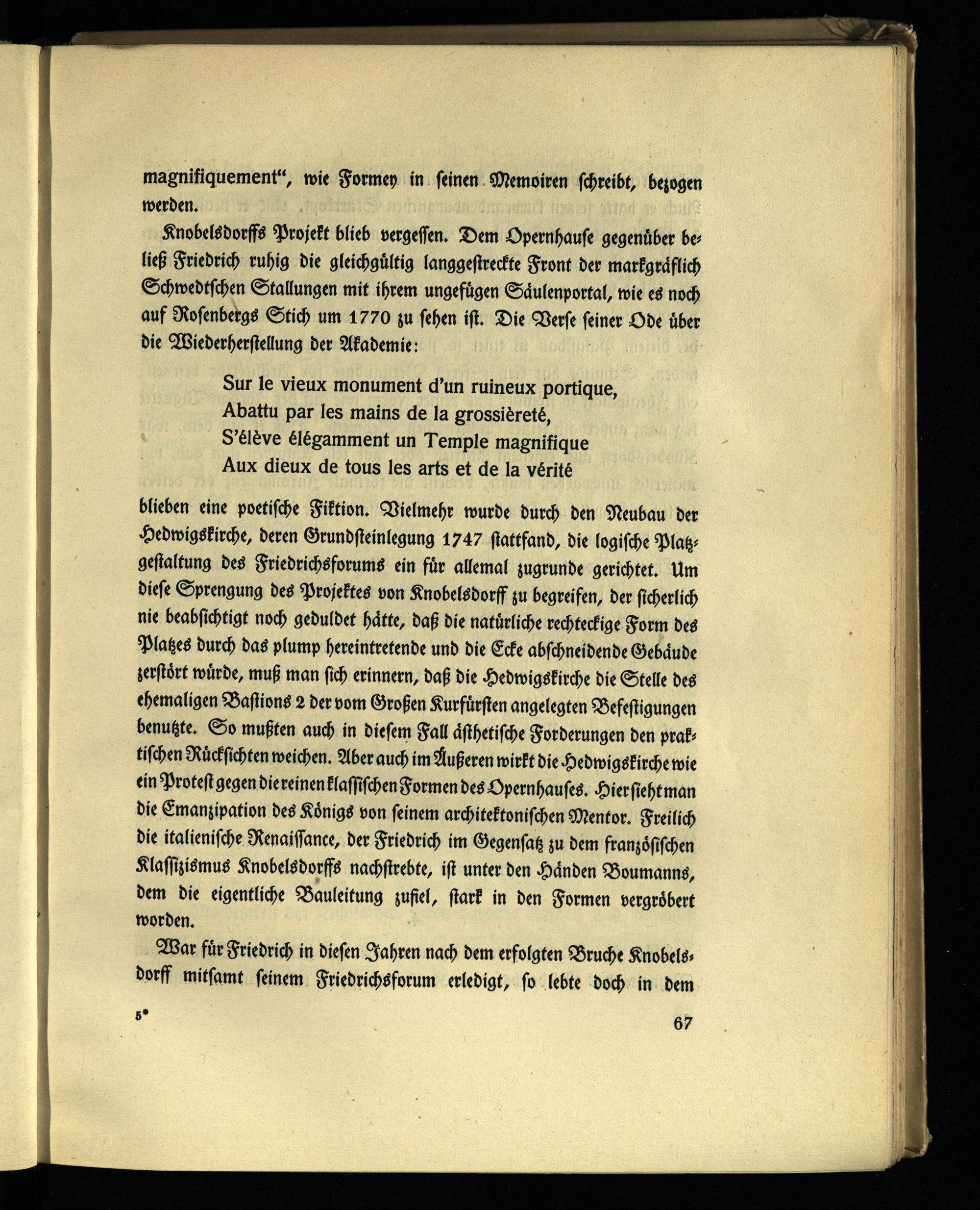 Knobelsdorffs Projekt blieb vergessen. Dem Qpernhause gegenüber beließ Friedrich ruhig die gleichgültig langgestreckte Front der markgräflich Schwedischen Stallungen mit ihrem ungefügen Säulenportal, wie es noch auf Rosenbergs Stich um 1770 zu sehen ist. Die Verse seiner Ode über die Wiederherstellung der Akademie: