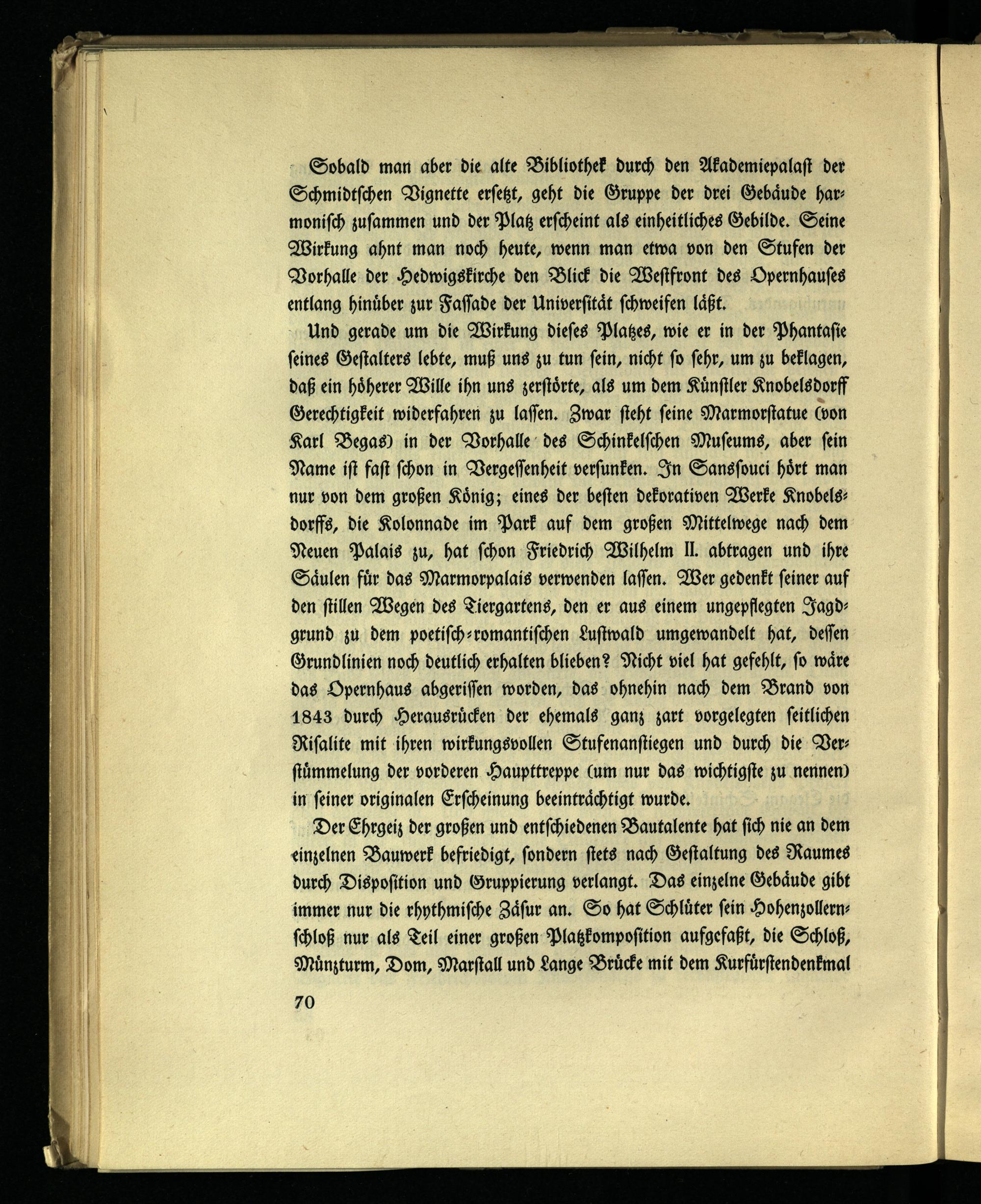 Und gerade um die Wirkung dieses Platzes, wie er in der Phantasie seines Gestalters lebte, muß uns zu tun sein, nicht so sehr, um zu beklagen, daß ein höherer Wille ihn uns zerstörte, als um dem Künstler Knobelsdorff Gerechtigkeit widerfahren zu lassen. Zwar steht seine Marmorstatue (von Karl Begas) in der Vorhalle des Schinkelschen Museums, aber sein Name ist fast schon in Vergessenheit versunken. In Sanssouci hört man nur von dem großen König; eines der besten dekorativen Werke Knobelsdorffs, die Kolonnade im Park auf dem großen Mittelwege nach dem Neuen Palais zu, hat schon Friedrich Wilhelm II. abtragen und ihre Säulen für das Marmorpalais verwenden lassen. Wer gedenkt seiner auf den stillen Wegen des Tiergartens, den er aus einem ungepflegten Jagdgrund zu dem poetisch-romantischen Lustwald umgewandelt hat, dessen Grundlinien noch deutlich erhalten blieben? Nicht viel hat gefehlt, so wäre das Opernhaus abgerissen worden, das ohnehin nach dem Brand von 1843 durch Herausrücken der ehemals ganz zart vorgelegten seitlichen Risalite mit ihren wirkungsvollen Stufenanstiegen und durch die Verstümmelung der vorderen Haupttreppe (um nur das wichtigste zu nennen) in seiner originalen Erscheinung beeinträchtigt wurde.
