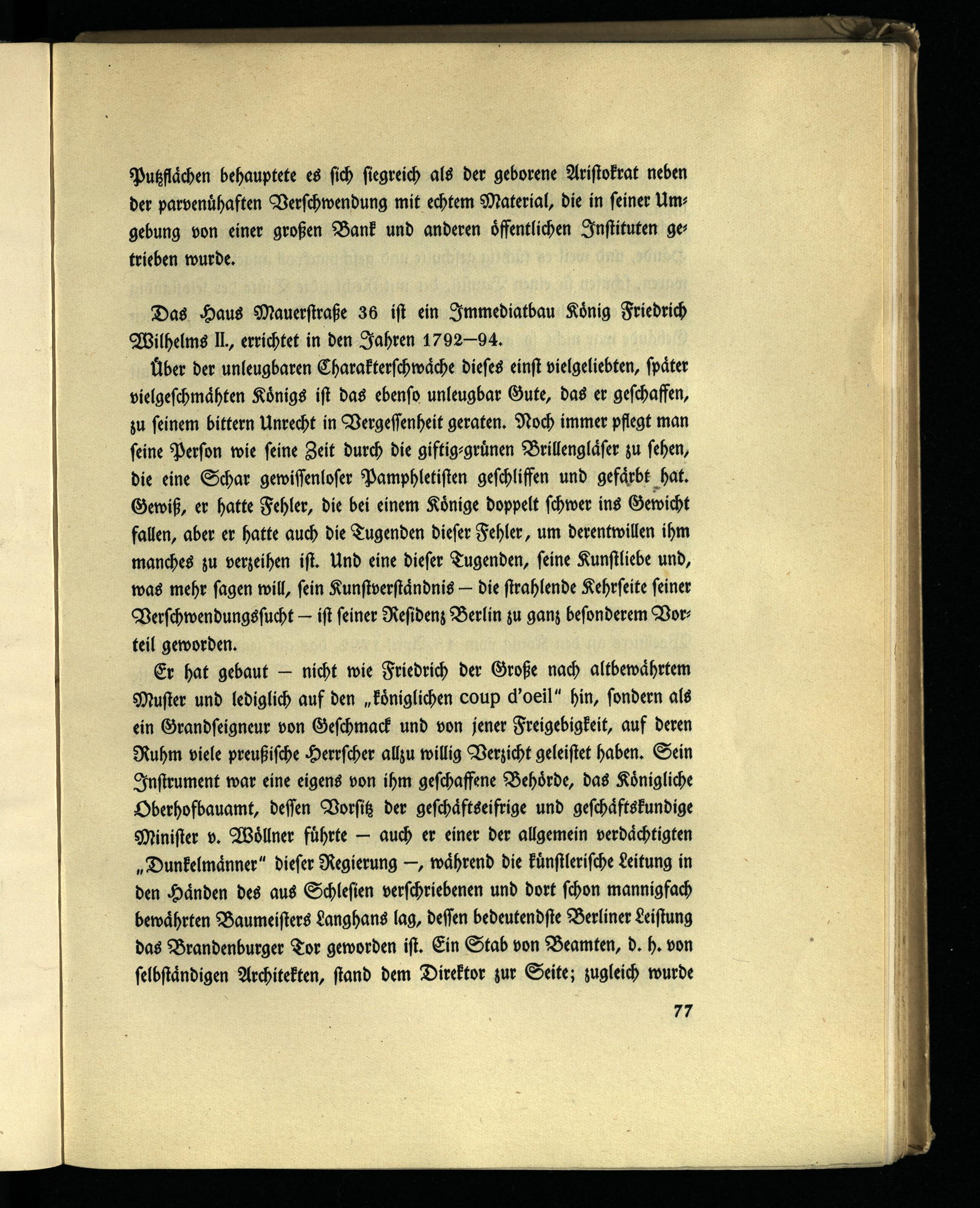 Er hat gebaut - nicht wie Friedrich der Große nach altbewährtem Muster und lediglich auf den „königlichen coup d'oeil" hin, sondern als ein Grandseigneur von Geschmack und von jener Freigebigkeit, auf deren Ruhm viele preußische Herrscher allzu willig Verzicht geleistet haben. Sein Instrument war eine eigens von ihm geschaffene Behörde, das Königliche Oberhofbauamt, dessen Vorsitz der geschäftseifrige und geschäftskundige Minister v. Wöllner führte — auch er einer der allgemein verdächtigten „Dunkelmänner" dieser Regierung -, während die künstlerische Leitung in den Händen des aus Schlesien verschriebenen und dort schon mannigfach bewährten Baumeisters Langhans lag, dessen bedeutendste Berliner Leistung das Brandenburger Tor geworden ist. Ein Stab von Beamten, d. h. von selbständigen Architekten, stand dem Direktor zur Seite; zugleich wurde