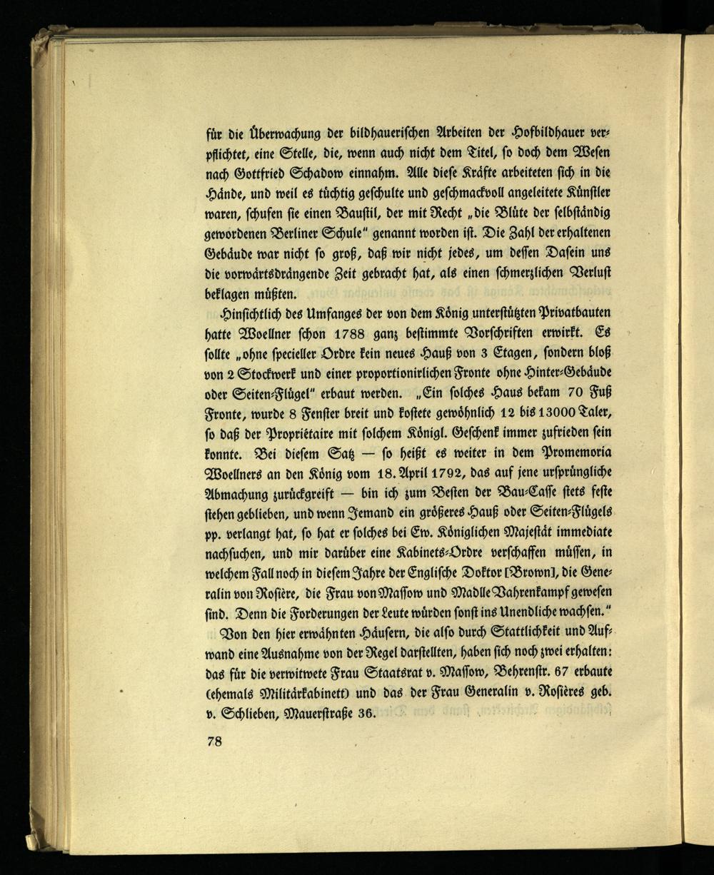 Hinsichtlich des Umfanges der von dem König unterstützten Privatbauten hatte Woellner schon 1788 ganz bestimmte Vorschriften erwirkt. Es sollte „ohne specieller Ordre kein neues Hauß von 3 Etagen, sondern bloß von 2 Stockwerk und einer proportionirlichen Fronte ohne Hinter-Gebäude oder Seiten-Flügel" erbaut werden. „Ein solches Haus bekam 70 Fuß Fronte, wurde 8 Fenster breit und kostete gewöhnlich 12 bis 13000 Taler, so daß der Propriétaire mit solchem Königl. Geschenk immer zufrieden sein konnte. Bei diesem Satz — so heißt es weiter in dem Promemoria Woellners an den König vom 18 . April 1792 , das auf jene ursprüngliche Abmachung zurückgreift — bin ich zum Besten der Bau-Casse stets feste stehen geblieben, und wenn Jemand ein größeres Hauß oder Seiten-Flügels pp. verlangt hat, so hat er solches bei Ew. Königlichen Majestät immediate nachsuchen, und mir darüber eine Kabinets-Ordre verschaffen müssen, in welchem Fall noch in diesem Jahre der Englische [Doktor Brown], die Generalin von Rosière, die Frau von Massow und Madlle Vahrenkampf gewesen sind. Denn die Forderungen der Leute würden sonst ins Unendliche wachsen."
