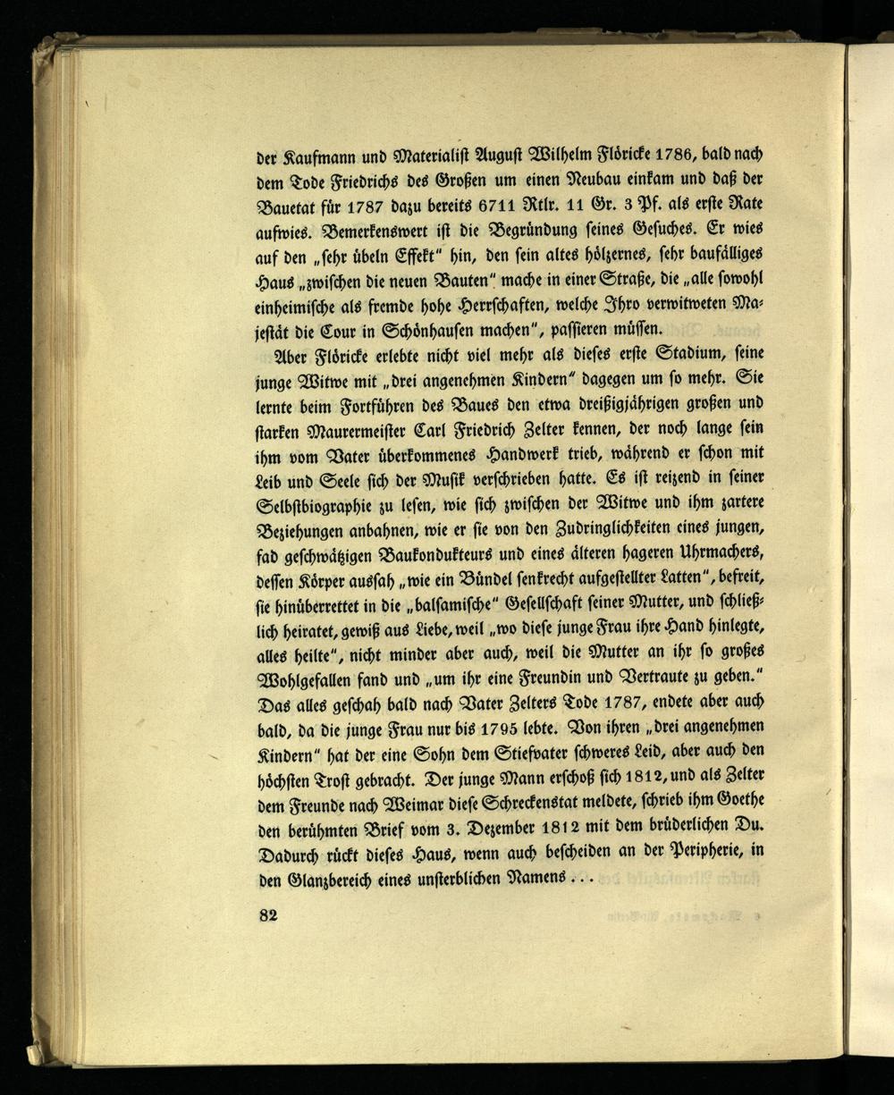 Aber Flöricke erlebte nicht viel mehr als dieses erste Stadium, seine junge Witwe mit „drei angenehmen Kindern" dagegen um so mehr. Sie lernte beim Fortführen des Baues den etwa dreißigjährigen großen und starken Maurermeister Carl Friedrich Zelter kennen, der noch lange sein ihm vom Vater überkommenes Handwerk trieb, während er schon mit Leib und Seele sich der Musik verschrieben hatte. Es ist reizend in seiner Selbstbiographie zu lesen, wie sich zwischen der Witwe und ihm zartere Beziehungen anbahnen, wie er sie von den Zudringlichkeiten eines jungen, fad geschwätzigen Baukondukteurs und eines älteren hageren Uhrmachers, dessen Körper aussah „wie ein Bündel senkrecht aufgestellter Latten", befreit, sie hinüberrettet in die „balsamische" Gesellschaft seiner Mutter, und schließlich heiratet, gewiß aus Liebe, weil „wo diese junge Frau ihre Hand hinlegte, alles heilte", nicht minder aber auch, weil die Mutter an ihr so großes Wohlgefallen fand und „um ihr eine Freundin und Vertraute zu geben." Das alles geschah bald nach Vater Zelters Tode 1787, endete aber auch bald, da die junge Frau nur bis 1795 lebte. Von ihren „drei angenehmen Kindern" hat der eine Sohn dem Stiefvater schweres Leid, aber auch den höchsten Trost gebracht. Der junge Mann erschoß sich 1812 , und als Zelter dem Freunde nach Weimar diese Schreckenstat meldete, schrieb ihm Goethe den berühmten Brief vom 3. Dezember 1812 mit dem brüderlichen Du. Dadurch rückt dieses Haus, wenn auch bescheiden an der Peripherie, in den Glanzbereich eines unsterblichen Namens...