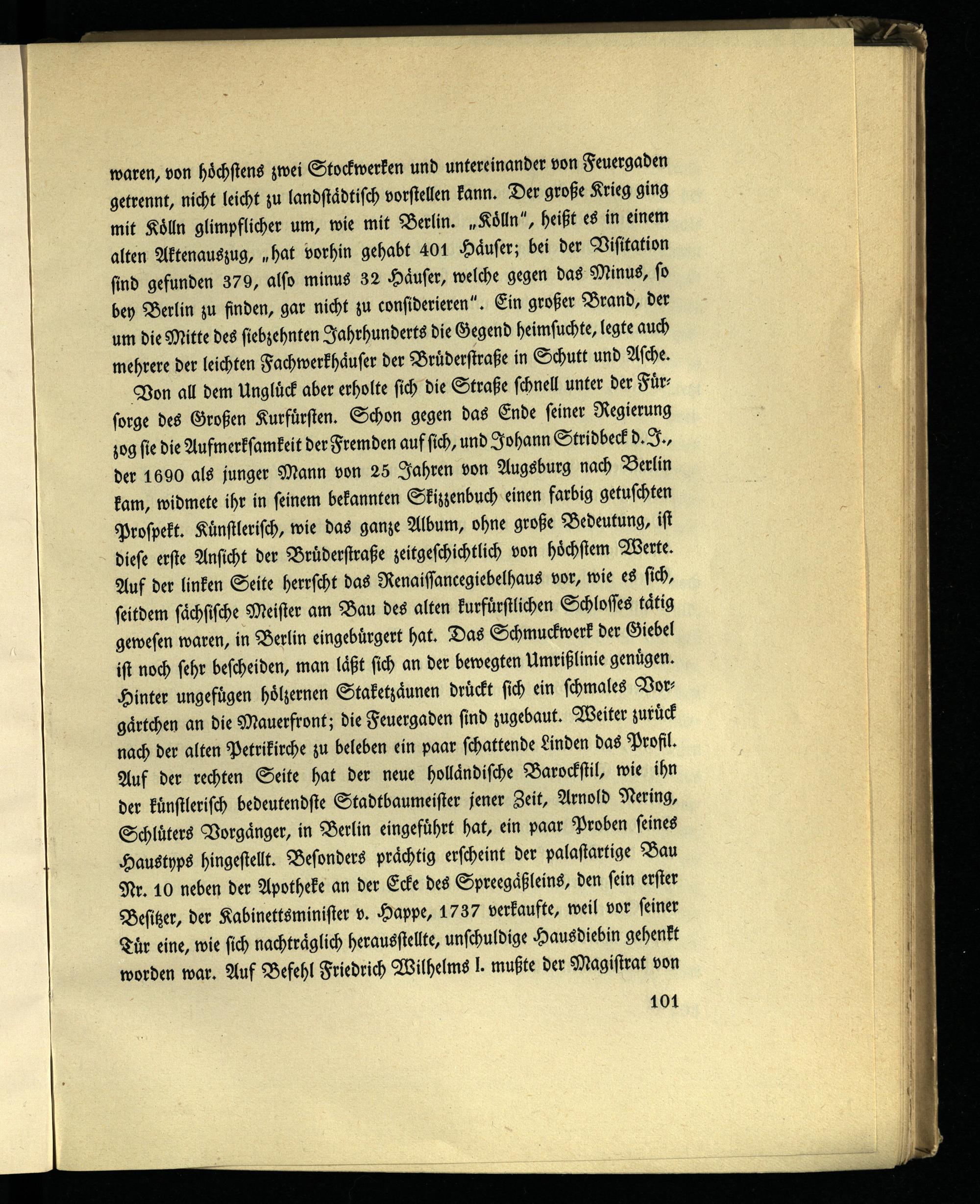Von all dem Unglück aber erholte sich die Straße schnell unter der Fürsorge des Großen Kurfürsten. Schon gegen das Ende seiner Regierung zog sie die Aufmerksamkeit der Fremden auf sich, und Johann Stridbeck d.J., der 1690 als junger Mann von 25 Jahren von Augsburg nach Berlin kam, widmete ihr in seinem bekannten Skizzenbuch einen farbig getuschten Prospekt. Künstlerisch, wie das ganze Album, ohne große Bedeutung, ist diese erste Ansicht der Brüderstraße zeitgeschichtlich von höchstem Werte. Auf der linken Seite herrscht das Renaissancegiebelhaus vor, wie es sich, seitdem sächsische Meister am Bau des alten kurfürstlichen Schlosses tätig gewesen waren, in Berlin eingebürgert hat. Das Schmuckwerk der Giebel ist noch sehr bescheiden, man läßt sich an der bewegten Umrißlinie genügen. Hinter ungefügen hölzernen Staketzäunen drückt sich ein schmales Vorgärtchen an die Mauerfront; die Feuergaden sind zugebaut. Weiter zurück nach der alten Petrikirche zu beleben ein paar schattende Linden das Profil. Auf der rechten Seite hat der neue holländische Barockstil, wie ihn der künstlerisch bedeutendste Stadtbaumeisier jener Zeit, Arnold Nering, Schlüters Vorgänger, in Berlin eingeführt hat, ein paar Proben seines Haustyps hingestellt. Besonders prächtig erscheint der palastartige Bau Nr. 10 neben der Apotheke an der Ecke des Spreegäßleins, den sein erster Besitzer, der Kabinettsminister v. Happe, 1737 verkaufte, weil vor seiner Tür eine, wie sich nachträglich herausstellte, unschuldige Hausdiebin gehenkt worden war. Auf Befehl Friedrich Wilhelms I. mußte der Magistrat von