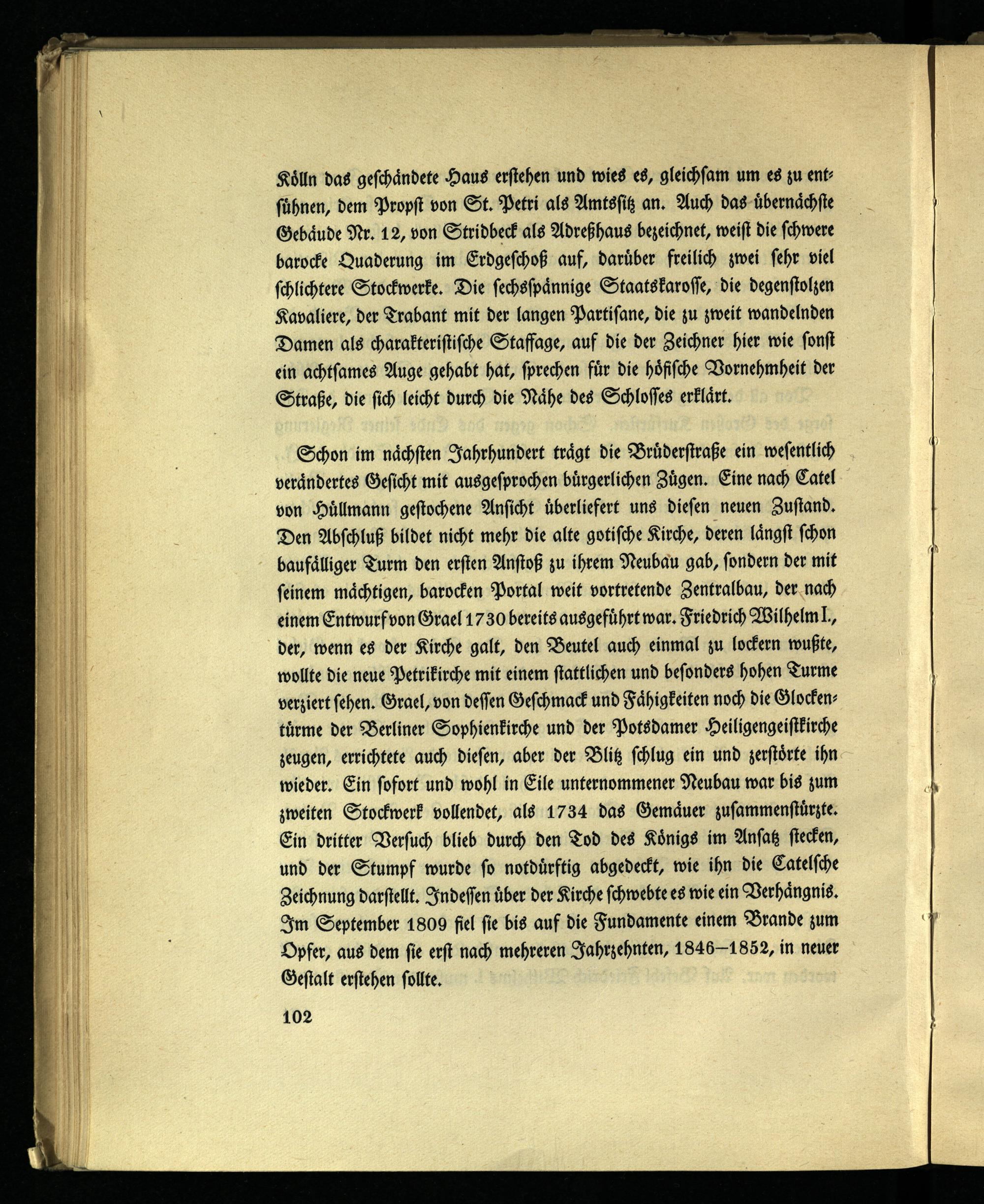 Schon im nächsten Jahrhundert trägt die Brüderstraße ein wesentlich verändertes Gesicht mit ausgesprochen bürgerlichen Zügen. Eine nach Catel von Hüllmann gestochene Ansicht überliefert uns diesen neuen Zustand. Den Abschluß bildet nicht mehr die alte gotische Kirche, deren längst schon baufälliger Turm den ersten Anstoß zu ihrem Neubau gab, sondern der mit seinem mächtigen, barocken Portal weit vortretende Zentralbau, der nach einem Entwurf von Grael 1730 bereits ausgeführt war. Friedrich Wilhelm I., der, wenn es der Kirche galt, den Beutel auch einmal zu lockern wußte, wollte die neue Petrikirche mit einem stattlichen und besonders hohen Turme verziert sehen. Grael, von dessen Geschmack und Fähigkeiten noch die Glockentürme der Berliner Sophienkirche und der Potsdamer Heiligengeistkirche zeugen, errichtete auch diesen, aber der Blitz schlug ein und zerstörte ihn wieder. Ein sofort und wohl in Eile unternommener Neubau war bis zum zweiten Stockwerk vollendet, als 1734 das Gemäuer zusammenstürzte. Ein dritter Versuch blieb durch den Tod des Königs im Ansatz stecken, und der Stumpf wurde so notdürftig abgedeckt, wie ihn die Catelsche Zeichnung darsiellt. Indessen über der Kirche schwebte es wie ein Verhängnis. Im September 1809 fiel sie bis auf die Fundamente einem Brande zum Opfer, aus dem sie erst nach mehreren Jahrzehnten, 1846-1852, in neuer Gestalt erstehen sollte.