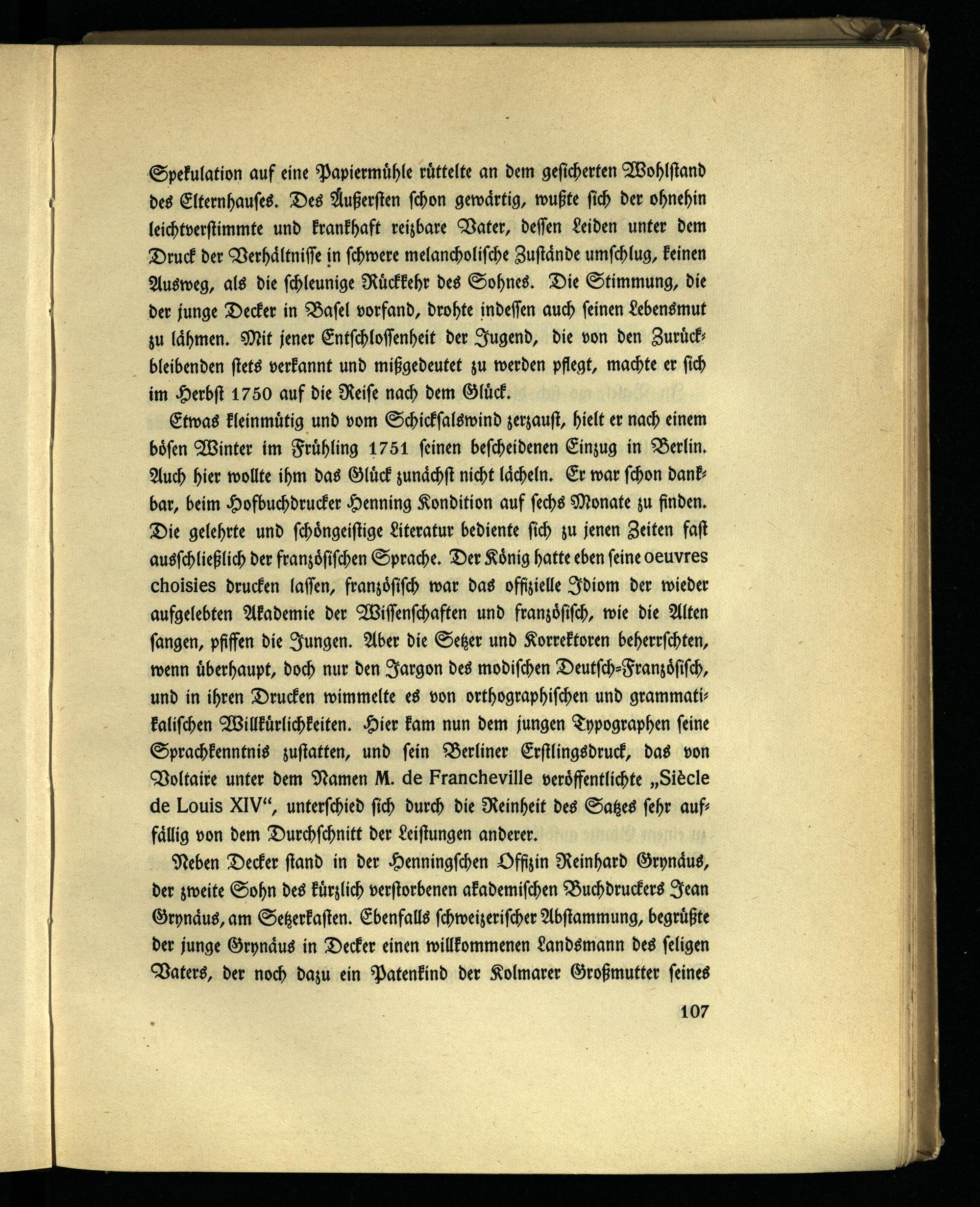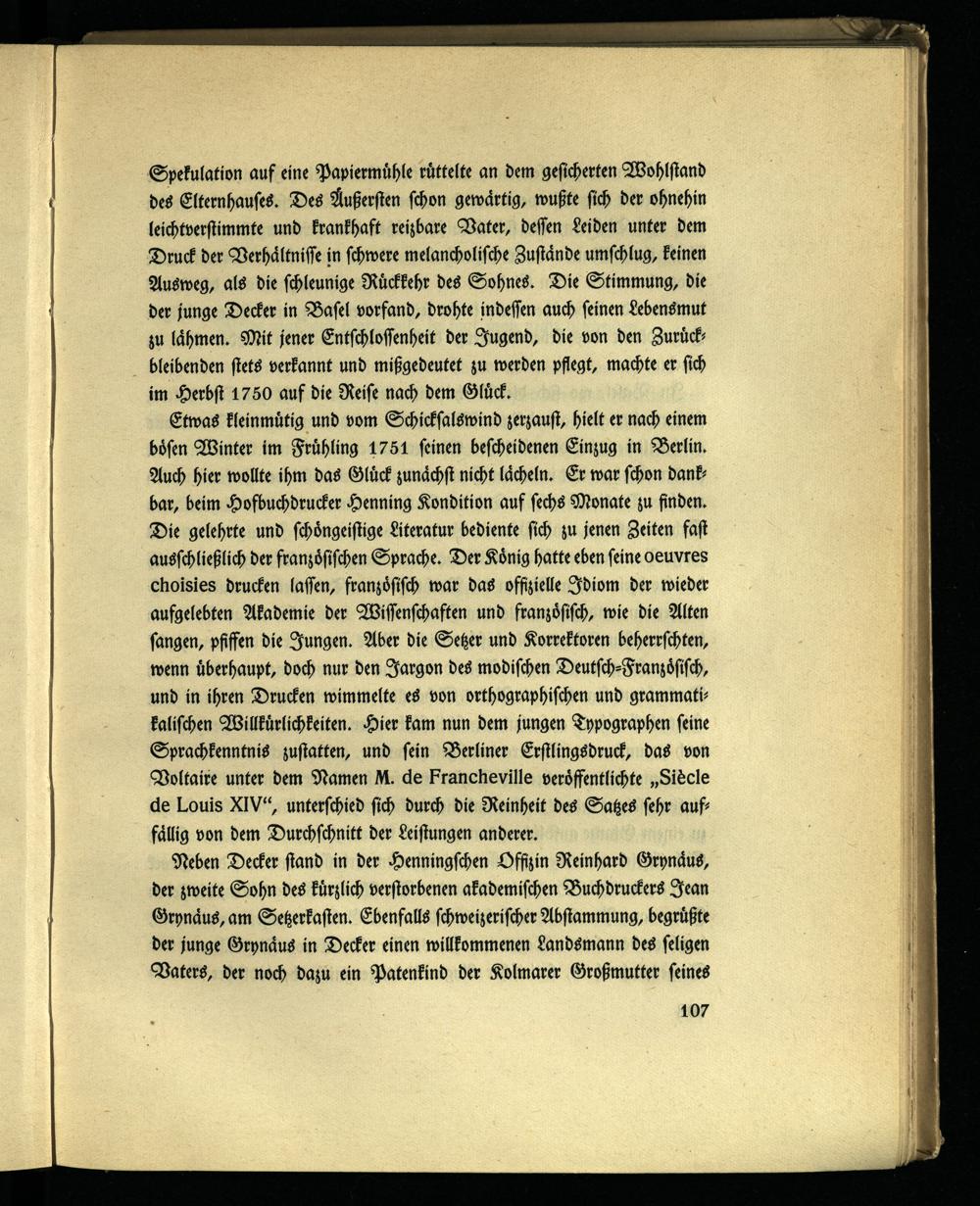 Etwas kleinmütig und vom Schicksalswind zerzaust, hielt er nach einem bösen Winter im Frühling 1751 seinen bescheidenen Einzug in Berlin. Auch hier wollte ihm das Glück zunächst nicht lächeln. Er war schon dankbar, beim Hofbuchdrucker Henning Kondition auf sechs Monate zu finden. Die gelehrte und schöngeistige Literatur bediente sich zu jenen Zeiten fast ausschließlich der französischen Sprache. Der König hatte eben seine oeuvres ckoiÄes drucken lassen, französisch war das offizielle Idiom der wieder aufgelebten Akademie der Wissenschaften und französisch, wie die Alten sangen, pfiffen die Jungen. Aber die Setzer und Korrektoren beherrschten, wenn überhaupt, doch nur den Jargon des modischen Deutsch-Französisch, und in ihren Drucken wimmelte es von orthographischen und grammatikalischen Willkürlichkeiten. Hier kam nun dem jungen Typographen seine Sprachkenntnis zustatten, und sein Berliner Erstlingsdruck, das von Voltaire unter dem Namen M. de Francheville veröffentlichte „Siècle de Louis XIV", unterschied sich durch die Reinheit des Satzes sehr auffällig von dem Durchschnitt der Leistungen anderer.