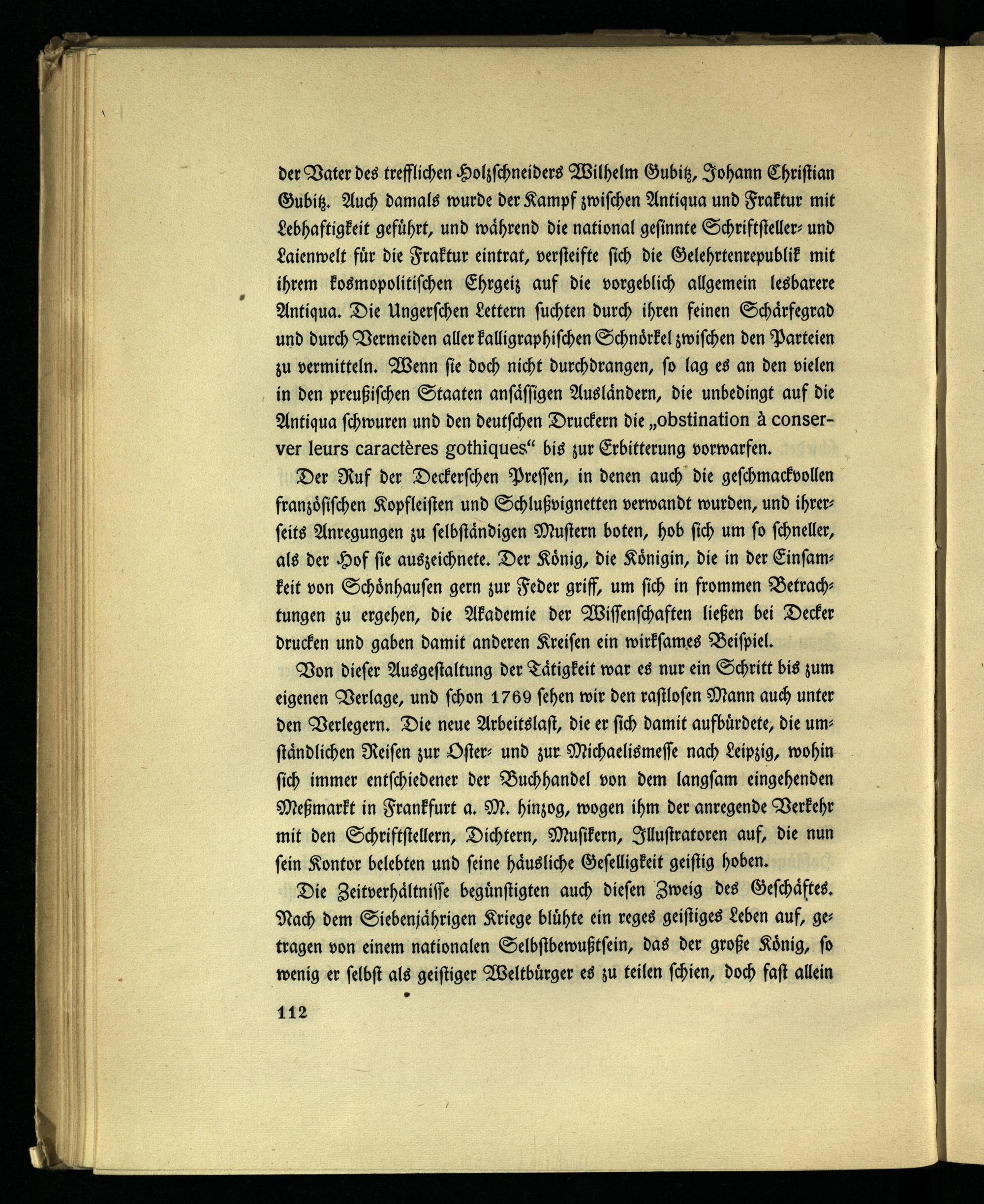 Der Ruf der Deckerschen Pressen, in denen auch die geschmackvollen französischen Kopfleisten und Schlußvignetten verwandt wurden, und ihrerseits Anregungen zu selbständigen Mustern boten, hob sich um so schneller, als der Hof sie auszeichnete. Der König, die Königin, die in der Einsamkeit von Schönhausen gern zur Feder griff, um sich in frommen Betrachtungen zu ergehen, die Akademie der Wissenschaften ließen bei Decker drucken und gaben damit anderen Kreisen ein wirksames Beispiel.