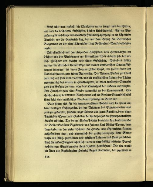 Bald stellten sich für die herangewachsenen Töchter auch die Freier ein, keine windigen Schöngeister, die den Reichtum des Schwiegervaters auszunützen gedachten, sondern junge Männer aus guten Familien, deren eigene Tüchtigkeit Sporn und Vorbild in der Gediegenheit des schwiegerelterlichen Hauses erblickte. Die beiden ältesten Töchter heirateten kurz hintereinander die Brüder Christian Sigismund und Johann Karl Philipp Spener, deren Lebensarbeit in den vielen Bänden der Haude- und Spenerschen Zeitung aufgespeichert liegt, und namentlich der geistig bewegliche Karl Spener wußte mit Witz, guter Laune und geselligen Talenten das Haus zu beleben. Auch die beiden Jüngsten ließen sich 1788 in einer fröhlich gefeierten Doppelhochzeit von Berufsgenossen ihres Vaters heimführen. Die eine wurde die Frau des Buchhändlers Heinrich August Rottmann, der gegenüber in
