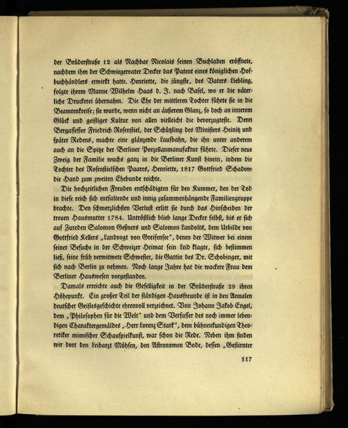 der Brüderstraße 12 als Nachbar Nicolais seinen Buchladen eröffnete, nachdem ihm der Schwiegervater Decker das Patent eines königlichen Hofbuchhändlers erwirkt hatte. Henriette, die jüngste, des Vaters Liebling, folgte ihrem Manne Wilhelm Haas d. J. nach Basel, wo er die väterliche Druckerei übernahm. Die Ehe der mittleren Tochter führte sie in die Beamtenkreise; sie wurde, wenn nicht an äußerem Glanz, so doch an innerem Glück und geistiger Kultur von allen vielleicht die bevorzugteste. Denn Bergaffeffor Friedrich Rosenstiel, der Schützling des Ministers Heinitz und später Redens, machte eine glänzende Laufbahn, die ihn unter anderem auch an die Spitze der Berliner Porzellanmanufaktur führte. Dieser neue Zweig der Familie wuchs ganz in die Berliner Kunst hinein, indem die Tochter des Rosenstielschen Paares, Henriette, 1817 Gottfried Schadow die Hand zum zweiten Ehebunde reichte.