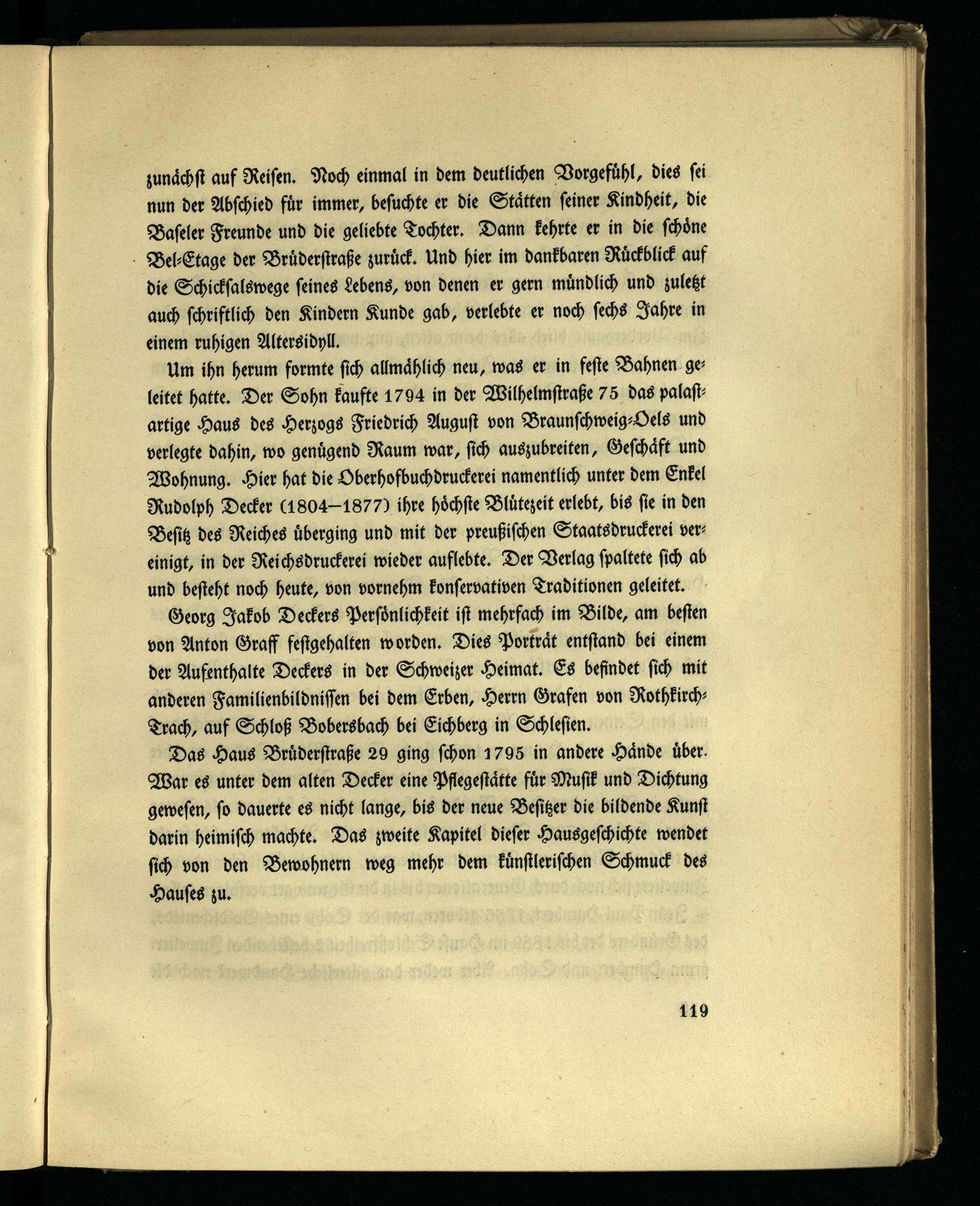 Um ihn herum formte fich allmählich neu, was er in feste Bahnen geleitet hatte. Der Sohn kaufte 1794 in der Wilhelmstraße 75 das palastartige Haus des Herzogs Friedrich August von Braunschweig-Oels und verlegte dahin, wo genügend Raum war, sich auszubreiten, Geschäft und Wohnung. Hier hat die Oberhofbuchdruckerei namentlich unter dem Enkel Rudolph Decker (1804-1877) ihre höchste Blütezeit erlebt, bis sie in den Besitz des Reiches überging und mit der preußischen Staatsdruckerei vereinigt, in der Reichsdruckerei wieder auflebte. Der Verlag spaltete sich ab und besteht noch heute, von vornehm konservativen Traditionen geleitet.