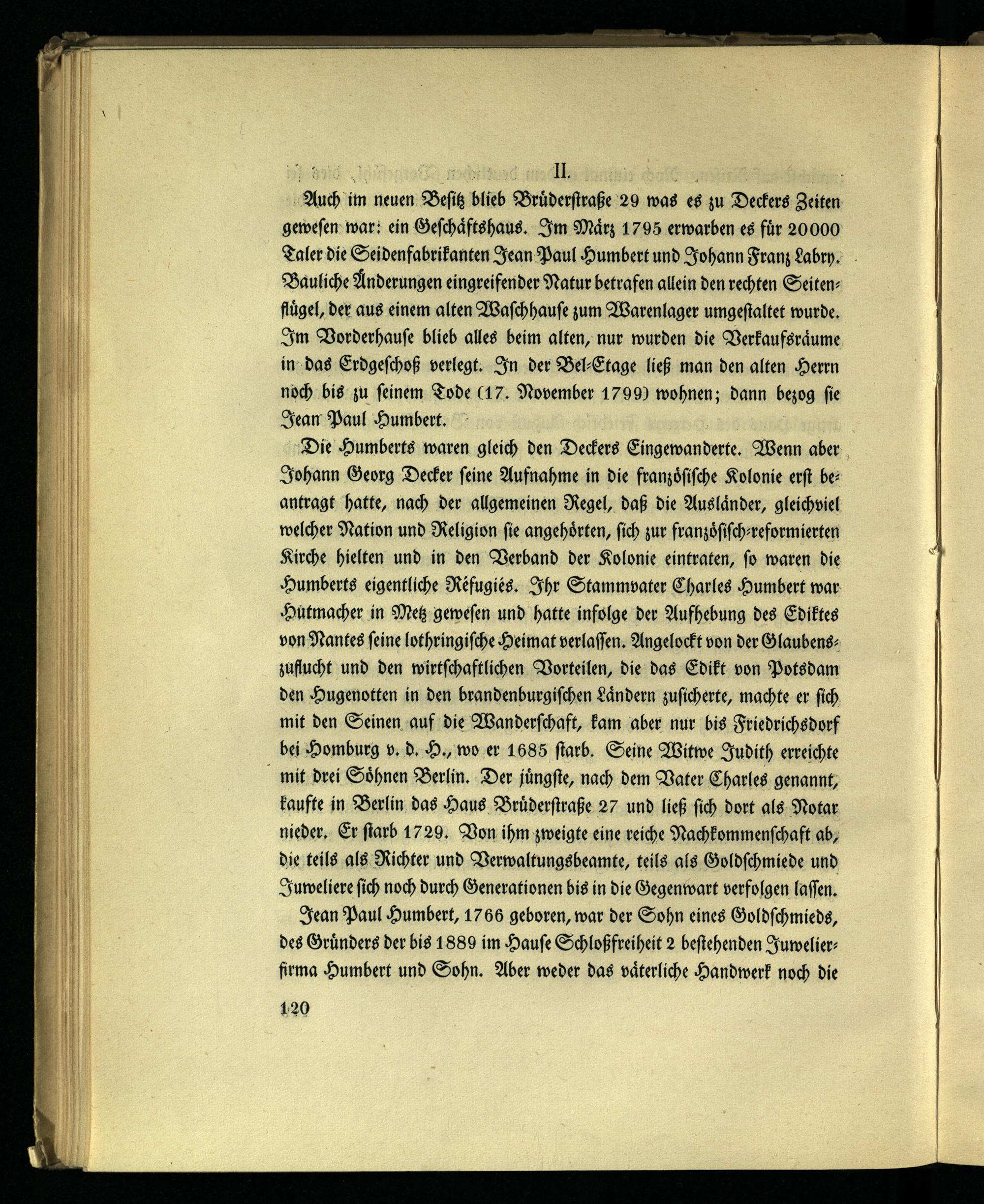 Die Humberts waren gleich den Deckers Eingewanderte. Wenn aber Johann Georg Decker seine Aufnahme in die französische Kolonie erst beantragt hatte, nach der allgemeinen Regel, daß die Ausländer, gleichviel welcher Nation und Religion sie angehörten, sich zur französisch-reformierten Kirche hielten und in den Verband der Kolonie eintraten, so waren die Humberts eigentliche Réfugiés. Ihr Stammvater Charles Humbert war Hutmacher in Metz gewesen und hatte infolge der Aufhebung des Ediktes von Nantes seine lothringische Heimat verlassen. Angelockt von der Glaubenszuflucht und den wirtschaftlichen Vorteilen, die das Edikt von Potsdam den Hugenotten in den brandenburgischen Ländern zusicherte, machte er sich mit den Seinen auf die Wanderschaft, kam aber nur bis Friedrichsdorf bei Homburg v. d. H., wo er 1685 starb. Seine Witwe Judith erreichte mit drei Söhnen Berlin. Der jüngste, nach dem Vater Charles genannt, kaufte in Berlin das Haus Brüdersiraße 27 und ließ sich dort als Notar nieder. Er starb 1729. Von ihm zweigte eine reiche Nachkommenschaft ab, die teils als Richter und Verwaltungsbeamte, teils als Goldschmiede und Juweliere sich noch durch Generationen bis in die Gegenwart verfolgen lassen.