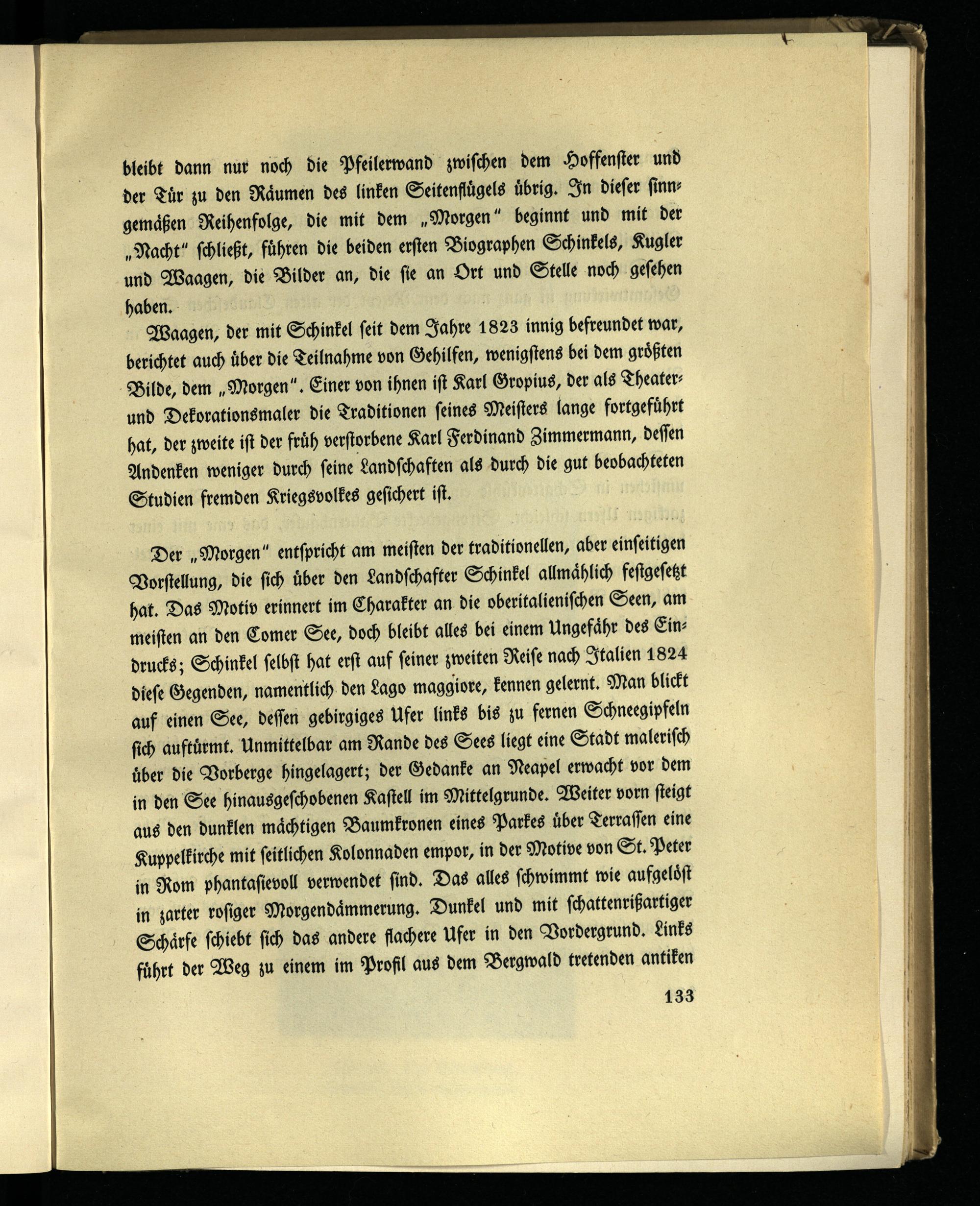 Waagen, der mit Schinkel seit dem Jahre 1823 innig befreundet war, berichtet auch über die Teilnahme von Gehilfen, wenigstens bei dem größten Bilde, dem „Morgen". Einer von ihnen ist Karl Gropius, der als Theater- und Dekorationsmaler die Traditionen seines Meisters lange fortgeführt hat, der zweite ist der früh verstorbene Karl Ferdinand Zimmermann, dessen Andenken weniger durch seine Landschaften als durch die gut beobachteten Studien fremden Kriegsvolkes gesichert ist.