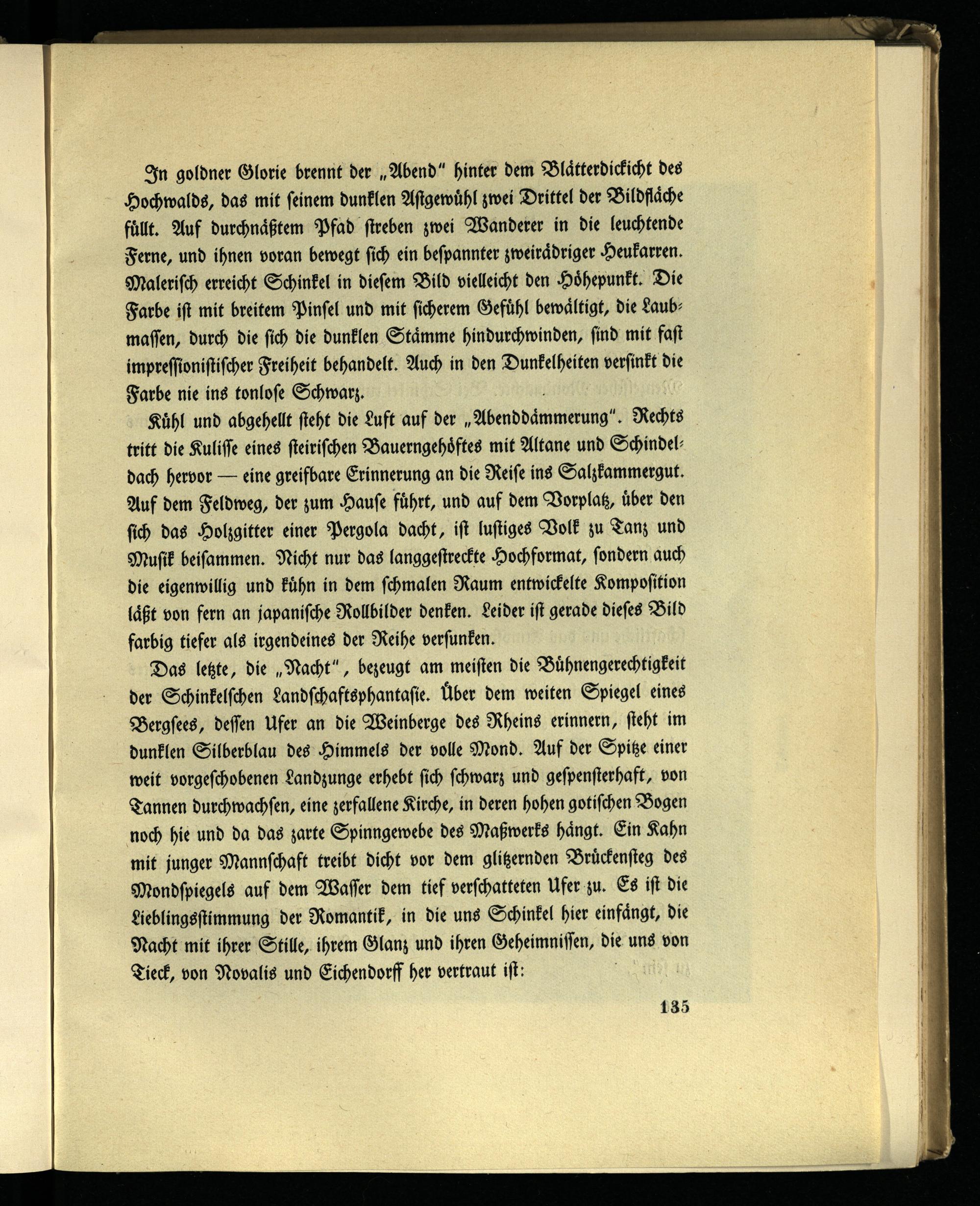 In goldner Glorie brennt der „Abend" hinter dem Blätterdickicht des Hochwalds, das mit seinem dunklen Astgewühl zwei Drittel der Bildfläche füllt. Auf durchnäßtem Pfad streben zwei Wanderer in die leuchtende Ferne, und ihnen voran bewegt sich ein bespannter zweirädriger Heukarren. Malerisch erreicht Schinkel in diesem Bild vielleicht den Höhepunkt. Die Farbe ist mit breitem Pinsel und mit sicherem Gefühl bewältigt, die Laub- Massen, durch die sich die dunklen Stämme hindurchwinden, sind mit fast impressionistischer Freiheit behandelt. Auch in den Dunkelheiten versinkt die Farbe nie ins tonlose Schwarz.