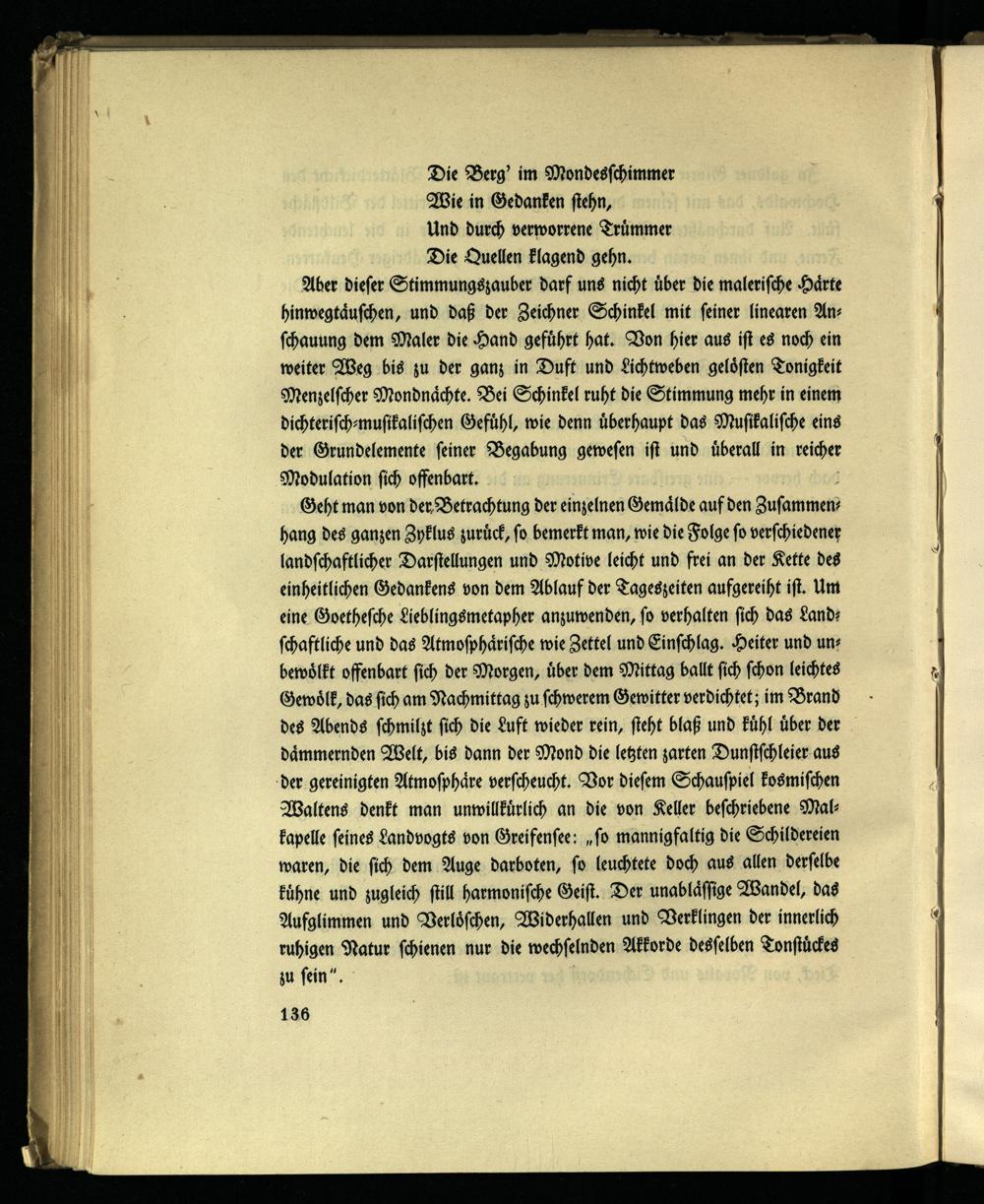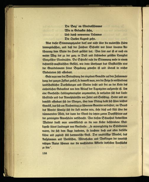 Aber dieser Stimmungszauber darf uns nicht über die malerische Härte hinwegtäufchen, und daß der Zeichner Schinkel mit seiner linearen Anschauung dem Maler die Hand geführt hat. Von hier aus ist es noch ein weiter Weg bis zu der ganz in Duft und Lichtweben gelösten Tonigkeit Menzelscher Mondnächte. Bei Schinkel ruht die Stimmung mehr in einem dichterisch-musikalischen Gefühl, wie denn überhaupt das Musikalische eins der Grundelemente seiner Begabung gewesen ist und überall in reicher Modulation sich offenbart.