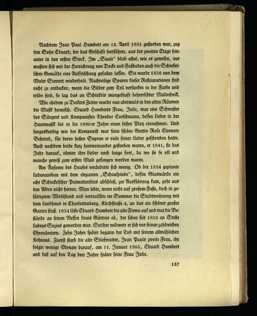 Nachdem Jean Paul Humbert am 12. April 1831 gestorben war, zog sein Sohn Eduard, der das Geschäft fortführte, aus der zweiten Etage Hins unter in den ersten Stock. Im „Saale" blieb alles, wie es gewesen, nur mußten sich mit der Herrichtung von Decke und Fußboden auch die Schinkel- scheu Gemälde eine Auffrischung gefallen lassen. Sie wurde 1856 von dem Maler Siewert wiederholt. Nachteilige Spuren dieser Restaurationen sind nicht zu entdecken; wenn die Bilder zum Teil versunken in der Farbe und trübe sind, so lag das an Schinkels mangelhaft beherrschter Maltechnik.