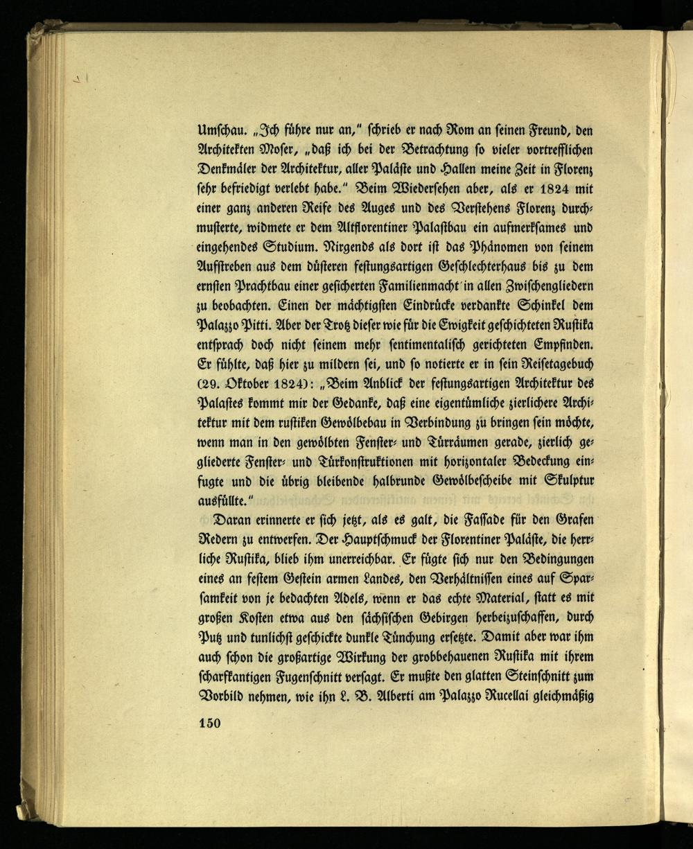 Umschau. „Ich führe nur an," schrieb er nach Rom an seinen Freund, den Architekten Moser, „daß ich bei der Betrachtung so vieler vortrefflichen Denkmäler der Architektur, aller Paläste und Hallen meine Zeit in Florenz sehr befriedigt verlebt habe." Beim Wiedersehen aber, als er 1824 mit einer ganz anderen Reife des Auges und des Verstehens Florenz durchmusterte, widmete er dem Altflorentiner Palastbau ein aufmerksames und eingehendes Studium. Nirgends als dort ist das Phänomen von seinem Aufstreben aus dem düsteren festungsartigen Geschlechterhaus bis zu dem ernsten Prachtbau einer gesicherten Familienmacht in allen Zwischengliedern zu beobachten. Einen der mächtigsten Eindrücke verdankte Schinkel dem Palazzo Pitti. Aber der Trotz dieser wie für die Ewigkeit geschichteten Rustika entsprach doch nicht seinem mehr sentimentalisch gerichteten Empfinden. Er fühlte, daß hier zu mildern sei, und so notierte er in sein Reisetagebuch ( 29 . Oktober 1824 ): „Beim Anblick der festungsartigen Architektur des Palastes kommt mir der Gedanke, daß eine eigentümliche zierlichere Architektur mit dem rustiken Gewölbebau in Verbindung zu bringen sein möchte, wenn man in den gewölbten Fenster- und Türräumen gerade, zierlich gegliederte Fenster- und Türkonstruktionen mit horizontaler Bedeckung einfugte und die übrig bleibende halbrunde Gewölbescheibe mit Skulptur ausfüllte."