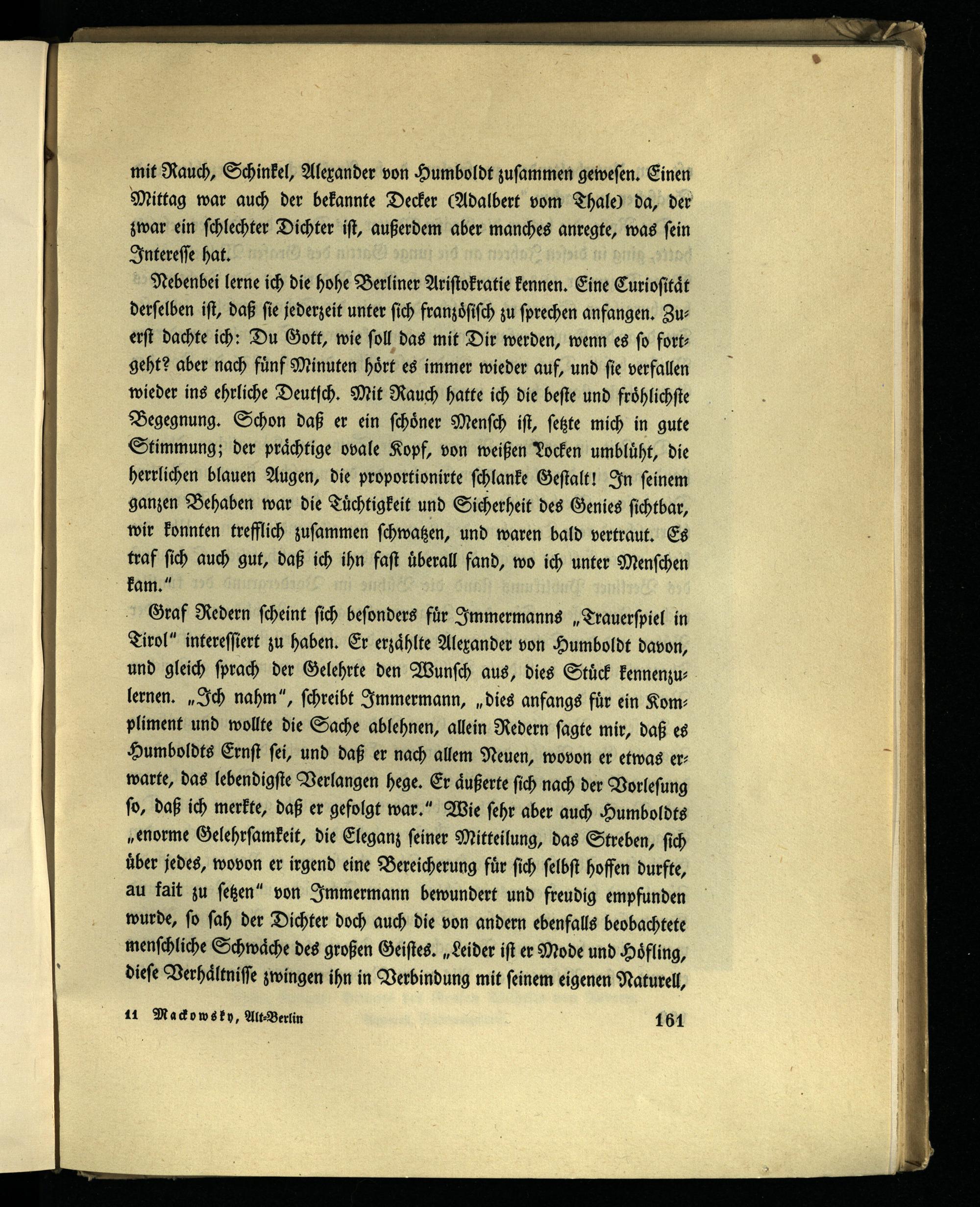 Graf Redern scheint sich besonders für Immermanns „Trauerspiel in Tirol" interessiert zu haben. Er erzählte Alexander von Humboldt davon, und gleich sprach der Gelehrte den Wunsch aus, dies Stück kennenzulernen. „Ich nahm", schreibt Jmmermann, „dies anfangs für ein Kompliment und wollte die Sache ablehnen, allein Redern sagte mir, daß es Humboldts Ernst sei, und daß er nach allem Neuen, wovon er etwas erwarte, das lebendigste Verlangen hege. Er äußerte sich nach der Vorlesung so, daß ich merkte, daß er gefolgt war." Wie sehr aber auch Humboldts „enorme Gelehrsamkeit, die Eleganz seiner Mitteilung, das Streben, sich über jedes, wovon er irgend eine Bereicherung für sich selbst hoffen durfte, au kait zu setzen" von Immermann bewundert und freudig empfunden wurde, so sah der Dichter doch auch die von andern ebenfalls beobachtete menschliche Schwäche des großen Geistes. „Leider ist er Mode und Höfling, diese Verhältnisse zwingen ihn in Verbindung mit seinem eigenen Naturell,