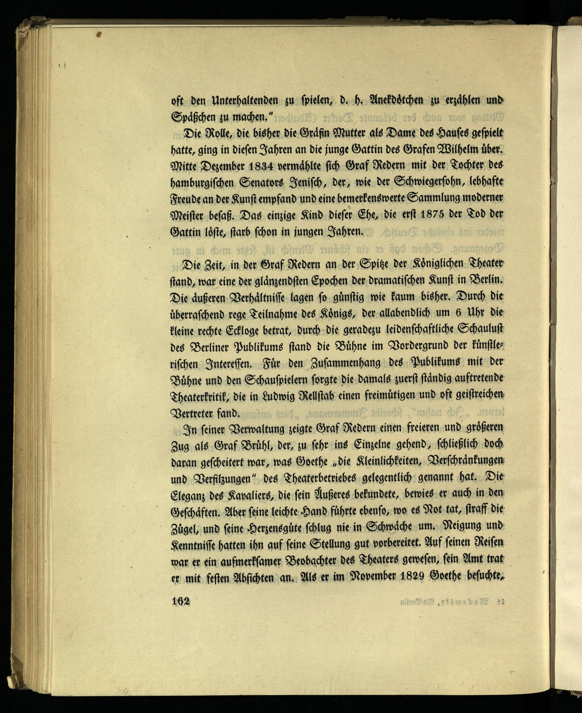 Die Zeit, in der Graf Redern an der Spitze der Königlichen Theater- stand, war eine der glänzendsten Epochen der dramatischen Kunst in Berlin. Die äußeren Verhältnisse lagen so günstig wie kaum bisher. Durch die überraschend rege Teilnahme des Königs, der allabendlich um 6 Uhr die kleine rechte Eckloge betrat, durch die geradezu leidenschaftliche Schaulust des Berliner Publikums stand die Bühne im Vordergrund der künstlerischen Interessen. Für den Zusammenhang des Publikums mit der Bühne und den Schauspielern sorgte die damals zuerst ständig auftretende Theaterkritik, die in Ludwig Rellstab einen freimütigen und oft geistreichen- Vertreter fand.