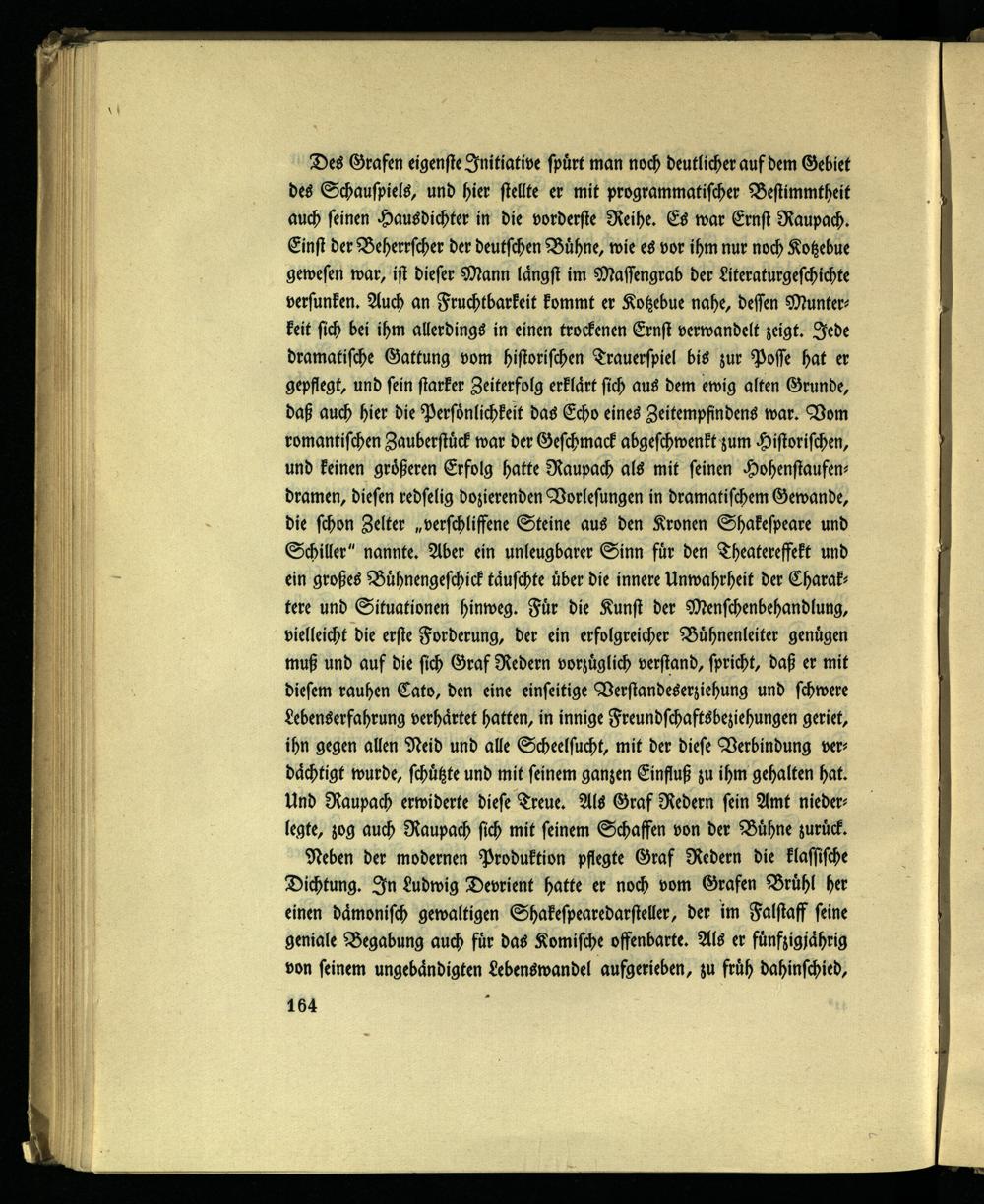 Des Grafen eigenste Initiative spürt man noch deutlicher auf dem Gebiet des Schauspiels, und hier stellte er mit programmatischer Bestimmtheit auch seinen Hausdichter in die vorderste Reihe. Es war Ernst Raupach. Einst der Beherrscher der deutschen Bühne, wie es vor ihm nur noch Kotzebue gewesen war, ist dieser Mann längst im Massengrab der Literaturgeschichte versunken. Auch an Fruchtbarkeit kommt er Kotzebue nahe, dessen Munterkeit sich bei ihm allerdings in einen trockenen Ernst verwandelt zeigt. Jede dramatische Gattung vom historischen Trauerspiel bis zur Posse hat er gepflegt, und sein starker Zeiterfolg erklärt sich aus dem ewig alten Grunde, daß auch hier die Persönlichkeit das Echo eines Zeitempfindens war. Vom romantischen Zauberstück war der Geschmack abgeschwenkt zum Historischen, und keinen größeren Erfolg hatte Raupach als mit seinen Hohensiaufen- dramen, diesen redselig dozierenden Vorlesungen in dramatischem Gewände, die schon Zelter „verschlissene Steine aus den Kronen Shakespeare und Schiller" nannte. Aber ein unleugbarer Sinn für den Theatereffekt und ein großes Bühnengeschick täuschte über die innere Unwahrheit der Charaktere und Situationen hinweg. Für die Kunst der Menschenbehandlung, vielleicht die erste Forderung, der ein erfolgreicher Bühnenleiter genügen muß und auf die sich Graf Redern vorzüglich verstand, spricht, daß er mit diesem rauhen Cato, den eine einseitige Verstandeserziehung und schwere Lebenserfahrung verhärtet hatten, in innige Freundschaftsbeziehungen geriet, ihn gegen allen Neid und alle Scheelsucht, mit der diese Verbindung verdächtigt wurde, schützte und mit seinem ganzen Einfluß zu ihm gehalten hat. Und Raupach erwiderte diese Treue. Als Graf Redern sein Amt niederlegte, zog auch Raupach sich mit seinem Schaffen von der Bühne zurück.
