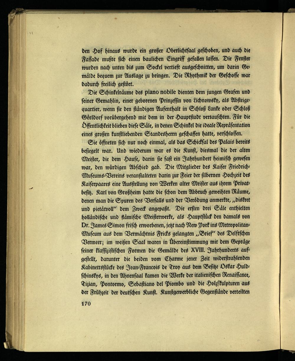 Sie öffneten sich nur noch einmal, als das Schicksal des Palais bereits besiegelt war. Und wiederum war es die Kunst, diesmal die der alten Meister, die dem Hause, darin sie fast ein Jahrhundert heimisch gewesen war, den würdigen Abschied gab. Die Mitglieder des Kaiser Friedrich- Museums-Vereins veranstalteten darin zur Feier der silbernen Hochzeit des Kaiserpaares eine Ausstellung von Werken alter Meister aus ihrem Privatbesitz. Karl von Großheim hatte die schon dem Abbruch geweihten Räume, denen man die Spuren des Verfalls und der Verödung anmerkte, „diskret und pietätvoll" dem Zweck angepaßt. Die ersten drei Säle enthielten holländische und flämische Meisterwerke, als Hauptstück den damals von vr. James Simon frisch erworbenen, jetzt nach New York ins Metropolitan- Museum aus dem Vermächtnis Fricks gelangten „Brief" des Delftschen Vermeer; im weißen Saal waren in Übereinstimmung mit dem Gepräge seiner klassizistischen Formen die Gemälde des XVIII. Jahrhunderts aufgestellt, darunter die beiden vom Charme jener Zeit widerstrahlenden Kabinettsstücke des Jean-Francois de Troy aus dem Besitze Oskar Huld- schinskys, in den Ahnensaal kamen die Werke der italienischen Renaissance, Tizian, Pontormo, Sebastians del Piombo und die Holzskulpturen aus der Frühzeit der deutschen Kunst. Kunstgewerbliche Gegenstände verteilten