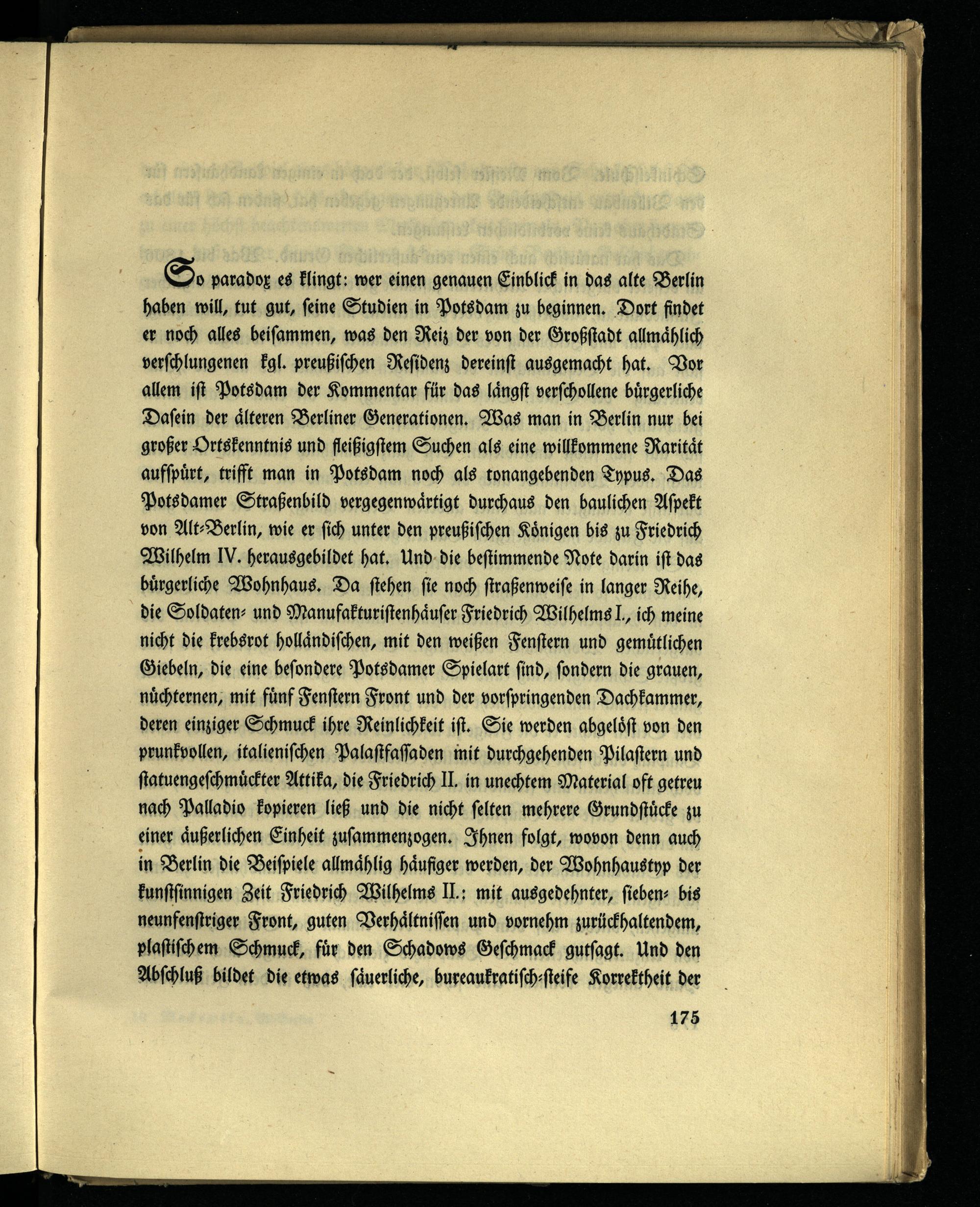 So paradox es klingt: wer einen genauen Einblick in das alte Berlin haben will, tut gut, seine Studien in Potsdam zu beginnen. Dort findet er noch alles beisammen, was den Reiz der von der Großstadt allmählich verschlungenen kgl. preußischen Residenz dereinst ausgemacht hat. Vor allem ist Potsdam der Kommentar für das längst verschollene bürgerliche Dasein der älteren Berliner Generationen. Was man in Berlin nur bei großer Ortskenntnis und fleißigstem Suchen als eine willkommene Rarität aufspürt, trifft man in Potsdam noch als tonangebenden Typus. Das Potsdamer Straßenbild vergegenwärtigt durchaus den baulichen Aspekt von Alt-Berlin, wie er sich unter den preußischen Königen bis zu Friedrich Wilhelm IV. herausgebildet hat. Und die bestimmende Note darin ist das bürgerliche Wohnhaus. Da stehen sie noch straßenweise in langer Reihe, die Soldaten- und Manufakturistenhäuser Friedrich Wilhelms I., ich meine nicht die krebsrot holländischen, mit den weißen Fenstern und gemütlichen Giebeln, die eine besondere Potsdamer Spielart sind, sondern die grauen, nüchternen, mit fünf Fenstern Front und der vorspringenden Dachkammer, deren einziger Schmuck ihre Reinlichkeit ist. Sie werden abgelösi von den prunkvollen, italienischen Palastfassaden mit durchgehenden Pilastern und statuengeschmückter Attika, die Friedrich II. in unechtem Material oft getreu nach Palladio kopieren ließ und die nicht selten mehrere Grundstücke zu einer äußerlichen Einheit zusammenzogen. Ihnen folgt, wovon denn auch in Berlin die Beispiele allmählig häufiger werden, der Wohnhaustyp der kunstsinnigen Zeit Friedrich Wilhelms II.: mit ausgedehnter, sieben- bis neunfenstriger Front, guten Verhältnissen und vornehm zurückhaltendem, plastischem Schmuck, für den Schadows Geschmack gutsagt. Und den Abschluß bildet die etwas säuerliche, bureaukratisch-steife Korrektheit der