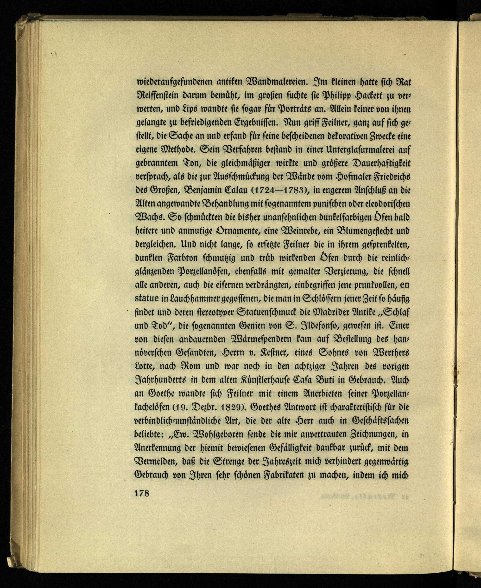 wiederaufgefundenen antiken Wandmalereien. Im kleinen hatte sich Rat Reiffenstein dämm bemüht, im großen suchte sie Philipp Hackert zu verwerten, und Lips wandte sie sogar für Porträts an. Allein keiner von ihnen gelangte zu befriedigenden Ergebnissen. Nun griffFeilner, ganz auf sich gestellt, die Sache an und erfand für seine bescheidenen dekorativen Zwecke eine eigene Methode. Sein Verfahren bestand in einer Unterglasurmalerei auf gebranntem Ton, die gleichmäßiger wirkte und größere Dauerhaftigkeit versprach, als die zur Ausschmückung der Wände vom Hofmaler Friedrichs des Großen, Benjamin Calau ( 1724 — 1783 ), in engerem Anschluß an die Alten angewandte Behandlung mit sogenanntem punischen oder eleodorischen Wachs. So schmückten die bisher unansehnlichen dunkelfarbigen Äsen bald heitere und anmutige Ornamente, eine Weinrebe, ein Blumengeflecht und dergleichen. Und nicht lange, so ersetzte Feilner die in ihrem gesprenkelten, dunklen Farbton schmutzig und trüb wirkenden Hfen durch die reinlichglänzenden Porzellanöfen, ebenfalls mit gemalter Verzierung, die schnell alle anderen, auch die eisernen verdrängten, einbegriffen jene prunkvollen, en 5l3lue in Lauchhammer gegossenen, die man in Schlössern jener Zeit so häufig findet und deren stereotyper Statuenschmuck die Madrider Antike „Schlaf und Tod", die sogenannten Genien von S. Ildefonso, gewesen ist. Einer von diesen andauernden Wärmespendern kam auf Bestellung des han- növerschen Gesandten, Herrn v. Kestner, eines Sohnes von Werthers Lotte, nach Rom und war noch in den achtziger Jahren des vorigen Jahrhunderts in dem alten Künsilerhause Casa Buti in Gebrauch. Auch an Goethe wandte sich Feilner mit einem Anerbieten seiner Porzellankachelöfen ( 19 . Dezbr. 1829 ). Goethes Antwort ist charakteristisch für die verbindlich-umständliche Art, die der alte Herr auch in Geschäftssachen beliebte: „Ew. Wohlgeboren sende die mir anvertrauten Zeichnungen, in Anerkennung der hiemit bewiesenen Gefälligkeit dankbar zurück, mit dem Vermelden, daß die Strenge der Jahreszeit mich verhindert gegenwärtig Gebrauch von Ihren sehr schönen Fabrikaten zu machen, indem ich mich