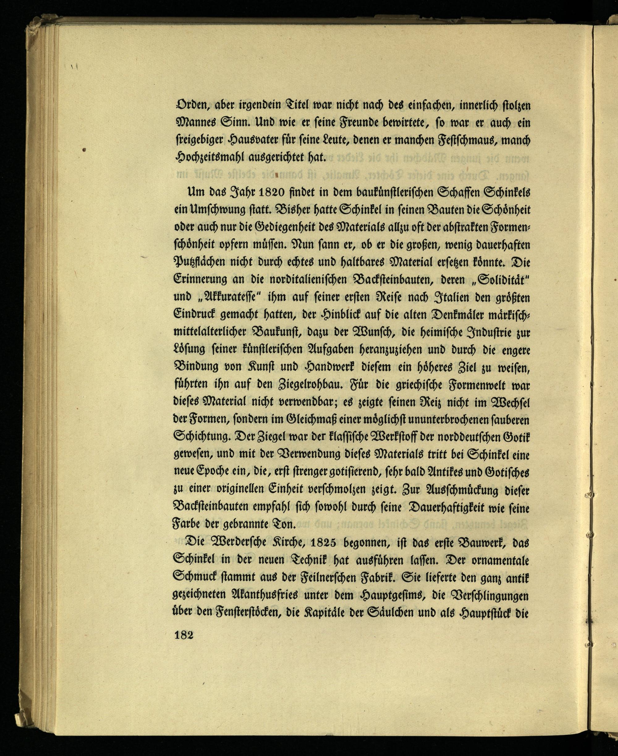 Um das Jahr 1820 findet in dem baukünstlerischen Schaffen Schinkels ein Umschwung statt. Bisher hatte Schinkel in seinen Bauten die Schönheit oder auch nur die Gediegenheit des Materials allzu oft der abstrakten Formenschönheit opfern müssen. Nun sann er, ob er die großen, wenig dauerhaften Putzflachen nicht durch echtes und haltbares Material ersetzen könnte. Die Erinnerung an die norditalienischen Backsteinbauten, deren „Solidität" und „Akkuratesse" ihm auf seiner ersten Reise nach Italien den größten Eindruck gemacht hatten, der Hinblick auf die alten Denkmäler märkischmittelalterlicher Baukunst, dazu der Wunsch, die heimische Industrie zur Lösung seiner künstlerischen Aufgaben heranzuziehen und durch die engere Bindung von Kunst und Handwerk diesem ein höheres Ziel zu weisen, führten ihn auf den Ziegelrohbau. Für die griechische Formenwelt war dieses Material nicht verwendbar; es zeigte seinen Reiz nicht im Wechsel der Formen, sondern im Gleichmaß einer möglichst ununterbrochenen sauberen Schichtung. Der Ziegel war der klassische Werkstoff der norddeutschen Gotik gewesen, und mit der Verwendung dieses Materials tritt bei Schinkel eine neue Epoche ein, die, erst strenger gotisierend, sehr bald Antikes und Gotisches zu einer originellen Einheit verschmolzen zeigt. Zur Ausschmückung dieser Backsteinbauten empfahl sich sowohl durch seine Dauerhaftigkeit wie seine Farbe der gebrannte Ton.