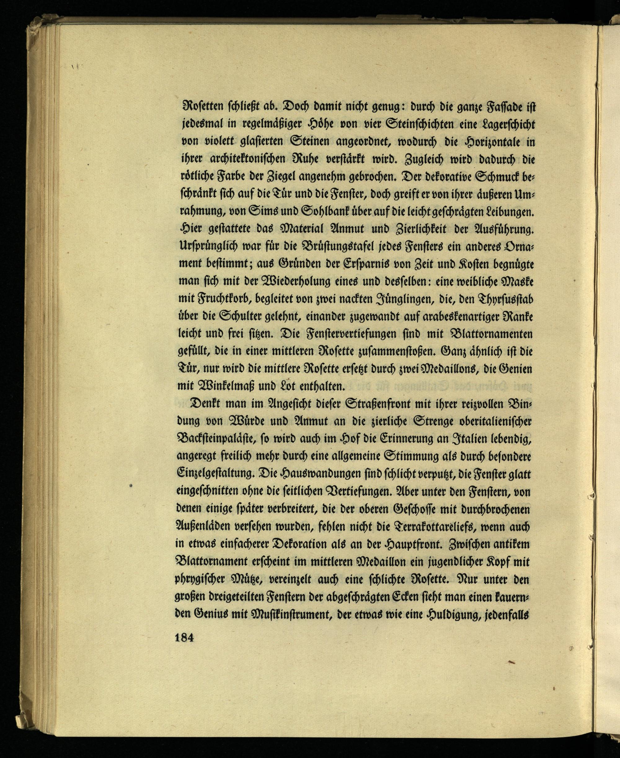 Rosetten schließt ab. Doch damit nicht genug: durch die ganze Fassade ist jedesmal in regelmäßiger Höhe von vier Steinschichten eine Lagerschicht von violett glasierten Steinen angeordnet, wodurch die Horizontale in ihrer architektonischen Ruhe verstärkt wird. Zugleich wird dadurch die rötliche Farbe der Ziegel angenehm gebrochen. Der dekorative Schmuck beschränkt sich auf die Tür und die Fenster, doch greift er von ihrer äußeren Umrahmung, von Sims und Sohlbank über auf die leicht geschrägten Leibungen. Hier gestattete das Material Anmut und Zierlichkeit der Ausführung. Ursprünglich war für die Brüstungstafel jedes Fensters ein anderes Ornament bestimmt; aus Gründen der Ersparnis von Zeit und Kosten begnügte man sich mit der Wiederholung eines und desselben: eine weibliche Maske mit Fruchtkorb, begleitet von zwei nackten Jünglingen, die, den Thyrsussiab über die Schulter gelehnt, einander zugewandt auf arabeskenartiger Ranke leicht und frei sitzen. Die Fenstervertiefungen sind mit Blattornamenten gefüllt, die in einer mittleren Rosette zusammenstoßen. Ganz ähnlich ist die Tür, nur wird die mittlere Rosette ersetzt durch zwei Medaillons, die Genien mit Winkelmaß und Lot enthalten.