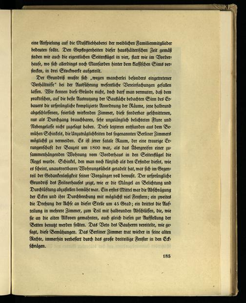 Der Grundriß mußte sich „wegen mancherlei besonders eingetretener Verhältnisse" bei der Ausführung wesentliche Vereinfachungen gefallen lassen. Wir kennen diese Gründe nicht, doch darf man vermuten, daß dem praktischen, auf die beste Ausnutzung der Baufläche bedachten Sinn des Erbauers die ursprüngliche komplizierte Anordnung der Räume, jene halbrund abgeschlossenen, feierlich wirkenden Zimmer, diese sonderbar geschnittenen, nur als Durchgang brauchbaren, sehr unzulänglich belichteten Flure und Nebengelaffe nicht zugesagt haben. Diese letzteren entstanden aus dem Bemühen Schinkels, die Unzuträglichkeiten des sogenannten Berliner Zimmers möglichst zu vermeiden. Es ist jener fatale Raum, der eine traurige Errungenschaft der Bauzeit um 1800 war, als das Übergreifen einer zusammenhängenden Wohnung vom Vorderhaus in den Seitenflügel die Regel wurde. Schinkel, den man noch kürzlich als den Erfinder dieses, wie es scheint, unausrottbaren Wohnungsübels getadelt hat, war sich im Gegenteil der Gedankenlosigkeit seiner Vorgänger voll bewußt. Der ursprüngliche Grundriß des Feilnerhauses zeigt, wie er die Mängel an Belichtung und Durchlüftung abzustellen bemüht war. Ein erstes Mittel war die Abschrägung der Ecken und ihre Durchbrechung mit möglichst viel Fenstern; ein zweites die Drehung der Achse an dieser Stelle um 45 Grad; ein drittes die Aufteilung in mehrere Zimmer, zum Teil mit halbrunden Abschlüssen, die, wie sie an die alten Alkoven gemahnten, auch gleich diesen zur Aufstellung der Betten benutzt werden sollten. Das Veto des Bauherrn vereitelte, wie gesagt, diese Bemühungen. Das Berliner Zimmer trat wieder in seine alten Rechte, immerhin verbessert durch das große dreiteilige Fenster in den Eckschrägen.