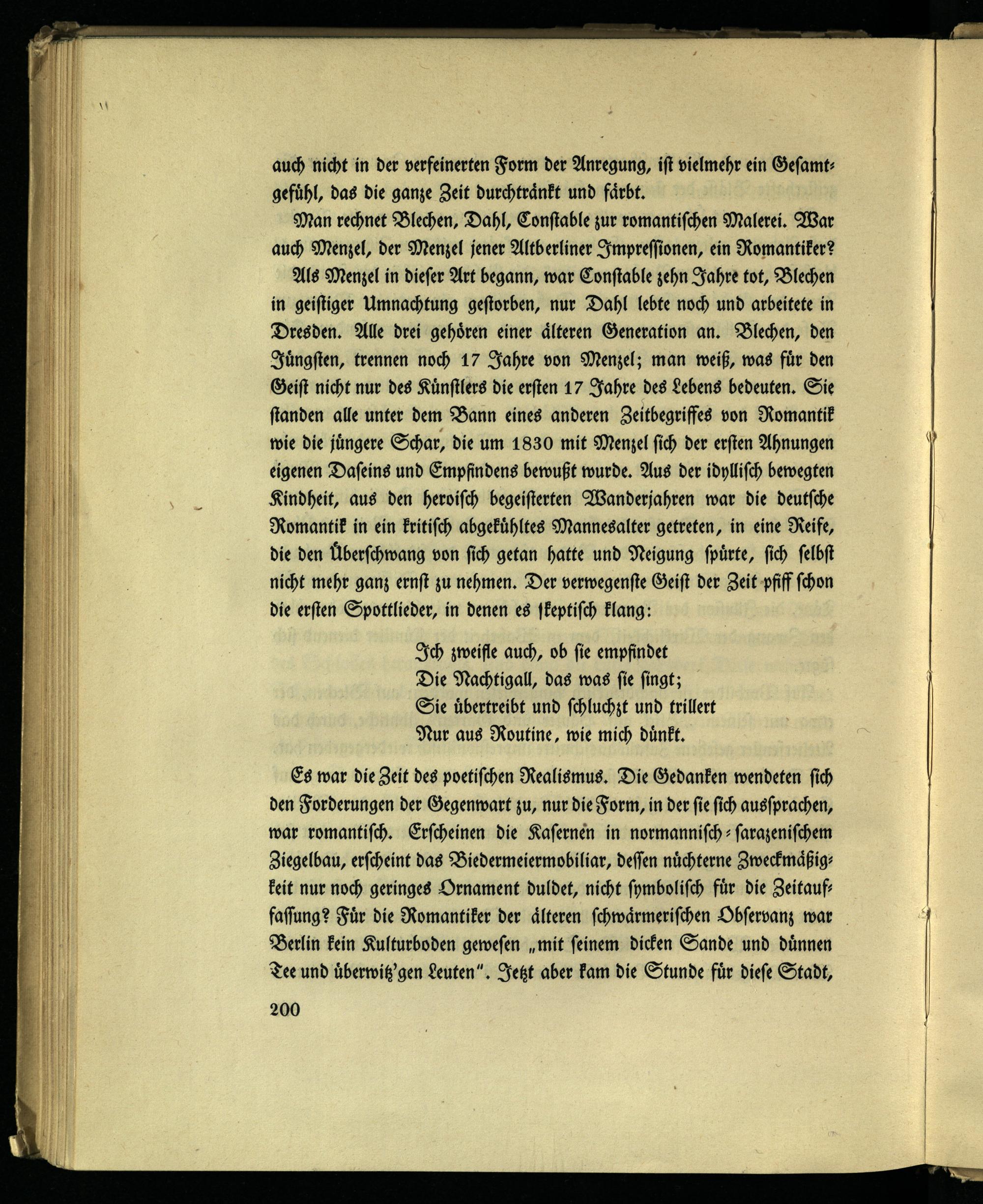 Als Menzel in dieser Art begann, war Constable zehn Jahre tot, Blechen in geistiger Umnachtung gestorben, nur Dahl lebte noch und arbeitete in Dresden. Alle drei gehören einer älteren Generation an. Blechen, den Jüngsten, trennen noch 17 Jahre von Menzel; man weiß, was für den Geist nicht nur des Künstlers die ersten 17 Jahre des Lebens bedeuten. Sie standen alle unter dem Bann eines anderen Zeitbegriffes von Romantik wie die jüngere Schar, die um 1830 mit Menzel sich der ersten Ahnungen eigenen Daseins und Empfindens bewußt wurde. Aus der idyllisch bewegten Kindheit, aus den heroisch begeisterten Wanderjahren war die deutsche Romantik in ein kritisch abgekühltes Mannesalter getreten, in eine Reife, die den Überschwang von sich getan hatte und Neigung spürte, sich selbst nicht mehr ganz ernst zu nehmen. Der verwegenste Geist der Zeit pfiff schon die ersten Spottlieder, in denen es skeptisch klang:
