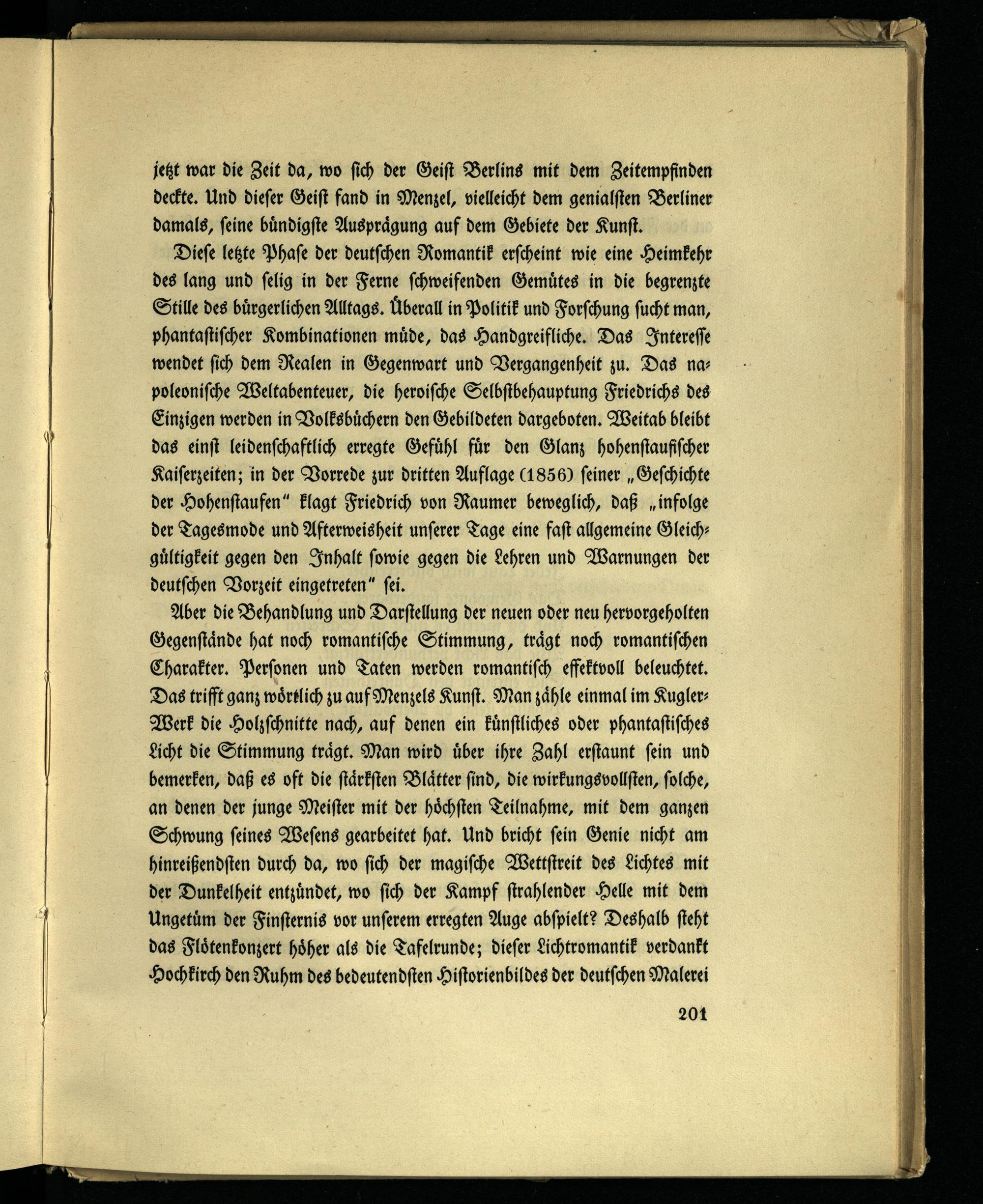 Aber die Behandlung und Darstellung der neuen oder neu hervorgeholten Gegenstände hat noch romantische Stimmung, trägt noch romantischen Charakter. Personen und Taten werden romantisch effektvoll beleuchtet. Das trifft ganz wörtlich zu aufMenzels Kunst. Man zähle einmal im Kugler- Werk die Holzschnitte nach, auf denen ein künstliches oder phantastisches Licht die Stimmung trägt. Man wird über ihre Zahl erstaunt sein und bemerken, daß es oft die stärksten Blätter sind, die wirkungsvollsten, solche, an denen der junge Meister mit der höchsten Teilnahme, mit dem ganzen Schwung seines Wesens gearbeitet hat. Und bricht sein Genie nicht am hinreißendsten durch da, wo sich der magische Wettstreit des Lichtes mit der Dunkelheit entzündet, wo sich der Kampf strahlender Helle mit dem Ungetüm der Finsternis vor unserem erregten Auge abspielt? Deshalb steht das Flötenkonzert höher als die Tafelrunde; dieser Lichtromantik verdankt Hochkirch den Ruhm des bedeutendsten Historienbildes der deutschen Malerei