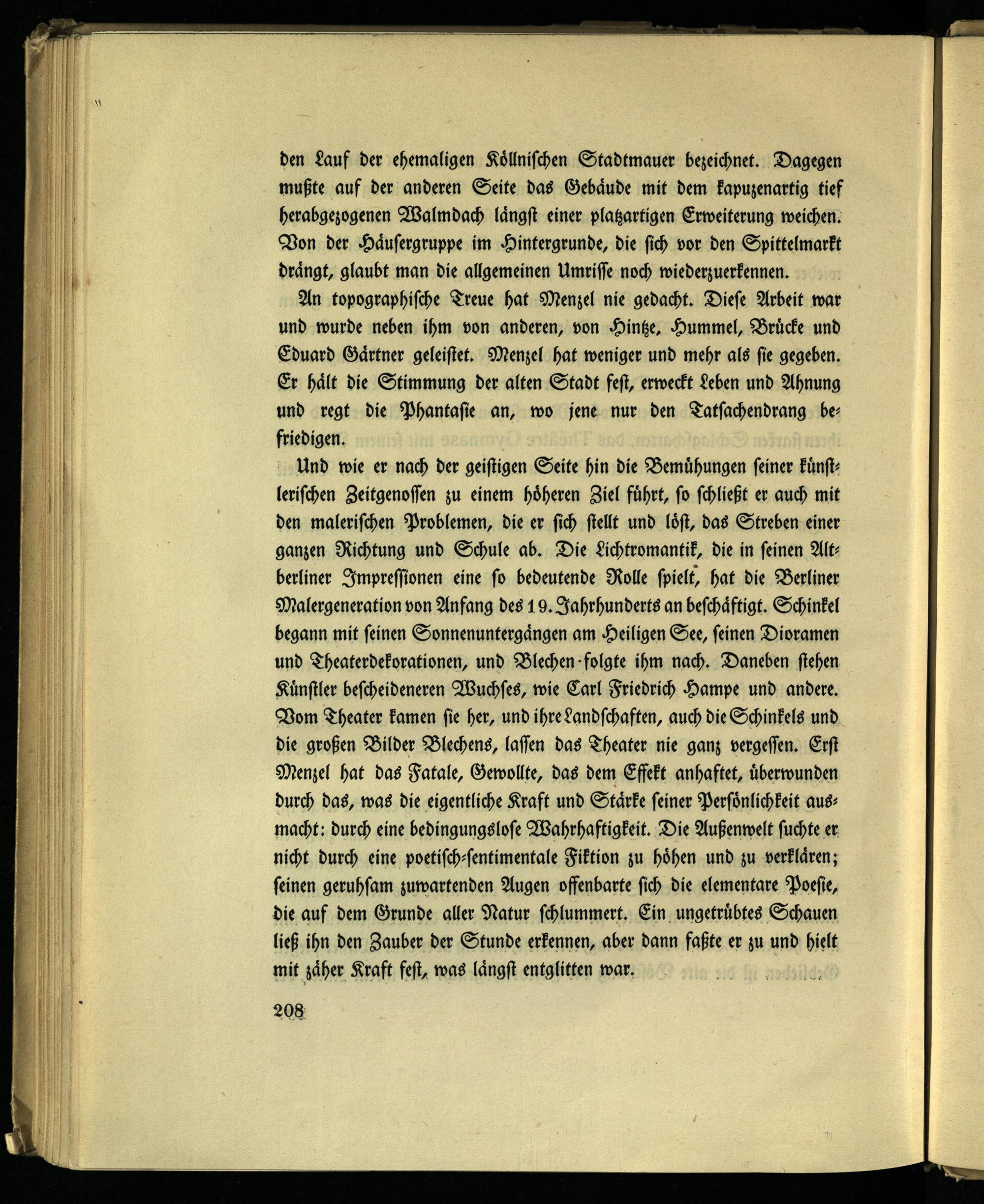 Und wie er nach der geistigen Seite hin die Bemühungen seiner künstlerischen Zeitgenossen zu einem höheren Ziel führt, so schließt er auch mit den malerischen Problemen, die er sich stellt und löst, das Streben einer ganzen Richtung und Schule ab. Die Lichtromantik, die in seinen Altberliner Impressionen eine so bedeutende Rolle spielt, hat die Berliner Malergeneration von Anfang des 19. Jahrhunderts an beschäftigt. Schinkel begann mit seinen Sonnenuntergängen am Heiligen See, seinen Dioramen und Theaterdekorationen, und Blechen folgte ihm nach. Daneben stehen Künstler bescheideneren Wuchses, wie Carl Friedrich Hampe und andere. Vom Theater kamen sie her, und ihre Landschaften, auch die Schinkels und die großen Bilder Blechens, lassen das Theater nie ganz vergessen. Erst Menzel hat das Fatale, Gewollte, das dem Effekt anhaftet, überwunden durch das, was die eigentliche Kraft und Stärke seiner Persönlichkeit ausmacht: durch eine bedingungslose Wahrhaftigkeit. Die Außenwelt suchte er nicht durch eine poetisch-sentimentale Fiktion zu höhen und zu verklären; seinen geruhsam zuwartenden Augen offenbarte sich die elementare Poesie, die auf dem Grunde aller Natur schlummert. Ein ungetrübtes Schauen ließ ihn den Zauber der Stunde erkennen, aber dann faßte er zu und hielt mit zäher Kraft fest, was längst entglitten war.