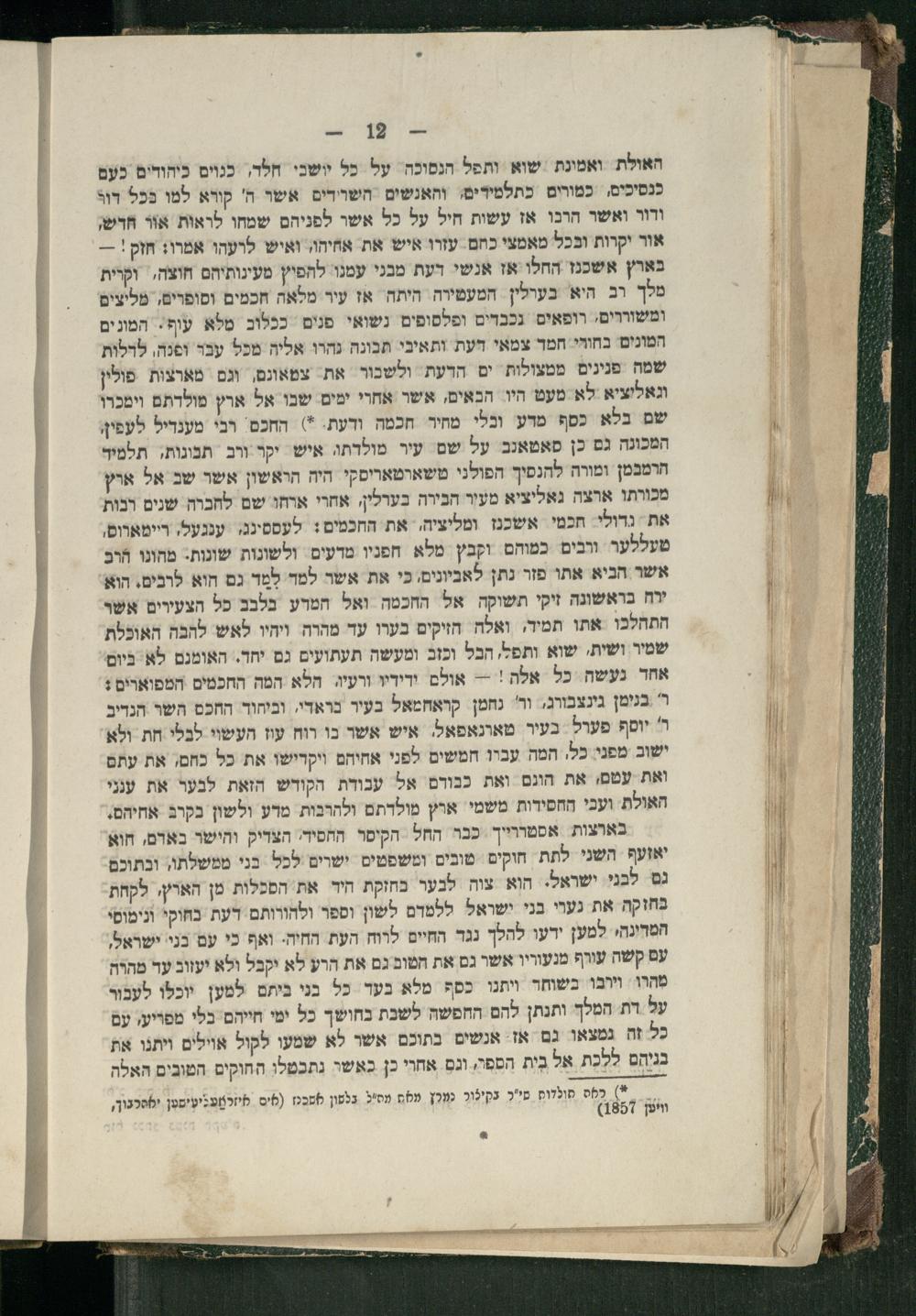 האולת ואמונת שוא ותפל הנסוכה. על כל יושבי חלד, כגוים כיהודים כעם כנסיכים, כמורים כתלמידים, והאנשים. השרידים. אשר ה' קורא למו בכל דור ודור ואשר הרכו אז עשות חיל על כל אשר לפניהם שמחו לראות אור חרש, אור יקרות ובכל מאמצי כחם עזרו איש את אחיהו, ואיש לרעהו אמרו: חזק!-בארץ אשכנז החלו אז אנשי דעת מבני עמנו להפיץ מעינותיהם חוצה, וקרית מלך רב היא בערלין המעטירה היתה. אז עיר מלאה חכמים וסופרים, מליצים ומשוררים, רופאים נכבדים ופלסופים. נשואי. פנים ככלוב מלא עוף: המונים המונים בחורי חמד צמאי דעת ותאיבי תבונה נהרו אליה מכל עבר ופנה, לרלות שמה מפנינים ממצולות ים הדעת ולשכור את צמאונם, וגם. מארצות פולין וגאליציא לא מעט היו הכאים, אשר אחרי ימים שבו אל ארץ מולדתם וימכרו שם בלא כסף מדע וכלי מחיר חכמה ודעת.*) החכם. רבי מענדיל לעפין, המכונה גם כן סאטאנב על שם עיר מולדתה איש יקר ורב תבונות, תלמיר הרמבמן ומורה להנסיך הפולני משארטאריסקי היה הראשון אשר שב אל אוץ מכורתו ארצה גאליציא מעיר הבירה בערלין; אחרי ארחו שם לחברה שנים רבות את גדולי. חכמי. אשכנז ומליציה, את החכמים: לעססיננו. ענגעל. ריימארוס, מעללער ורבים כמוהם וקבץ מלא חפניו מדעים ולשונות שונות- מהונו הר אשר הביא אתו פזר נתן לאביונים, כי את אשר למד לְמד גם הוא לרבים. הוא ירח בראשונה זיקי תשוקה אל החכמה ואל המרע בלבב כל הצעירים אשר התהלכו אתו תמיד, ואלה חזיקים בערו עד מהרה ויהיו לאש לחבה האוכלת שמיר ושית, שוא ותפל, הבל וכזב ומעשה תעתועים גם יחד. האומנם לא. ביום אחד נעשה כל אלה!-= אולם ודידיו ורעיג. הלא המה החכמים המפוארים: ר' בנימן גינצבורגי ור' נחמן קראחמאל בעיר בראדי, וביחוד החכם השר הנדיב ר' יוסף פערל בעיר מאונאפאל. איש אשר כו רוח עוז העשוי לבלי חת ולא ישוב מפני. כל, המה עברו חמשים לפני אחיהם וירישו את כל כחם, את עתם ואת עטםו את הונם ואת כנודם אל ענודת הקודש הזאת לבער את ענני האולת ועבי החסידות משמי ארץ מולדתם ולהרבות מרע ולשון בקרב אחיהם, בארצות אסמררייך ככר החל הקיסר החסיד. הצדיק והישר בארם, חוא יאזעף השני לתת חוקים טובים ומשפטים ישרים לכל בני ממשלתו, ובתוכם גם לבני. ישראל. הוא צוה לבער בחזקת היד את הסכלות מן הארץ, לקחת בחזקה את נערי בני ישראל ללמדם לשון וספר ולהורותם דעת בחוקי ונימוסי המרינהי למען ידעו להלך נגד החיים לרוח העת החיה. ואף בי עם בני ישראל, עם קשה עורף מנעוריו אשר גם את חטום גם את הרע לא יקבל ולא יעווב עד מהרה מהרו וירבו בשוחד ותנו כסף מלא בעד כל בני ביתם למען יוכלו לעבור על דת המלך ותנתן להם החפשה לשכת בחושך כל ימי חייהם. בלי מפריעו עם כל זה נמצאו גם אז. אנשים בתוכם אשר לא שמעו לקול אוילים ויתנו את בגיהֶם ללכת אל בית הספר ונם אחרי כן כאשר נתכמלו החוקים הטובים האלה