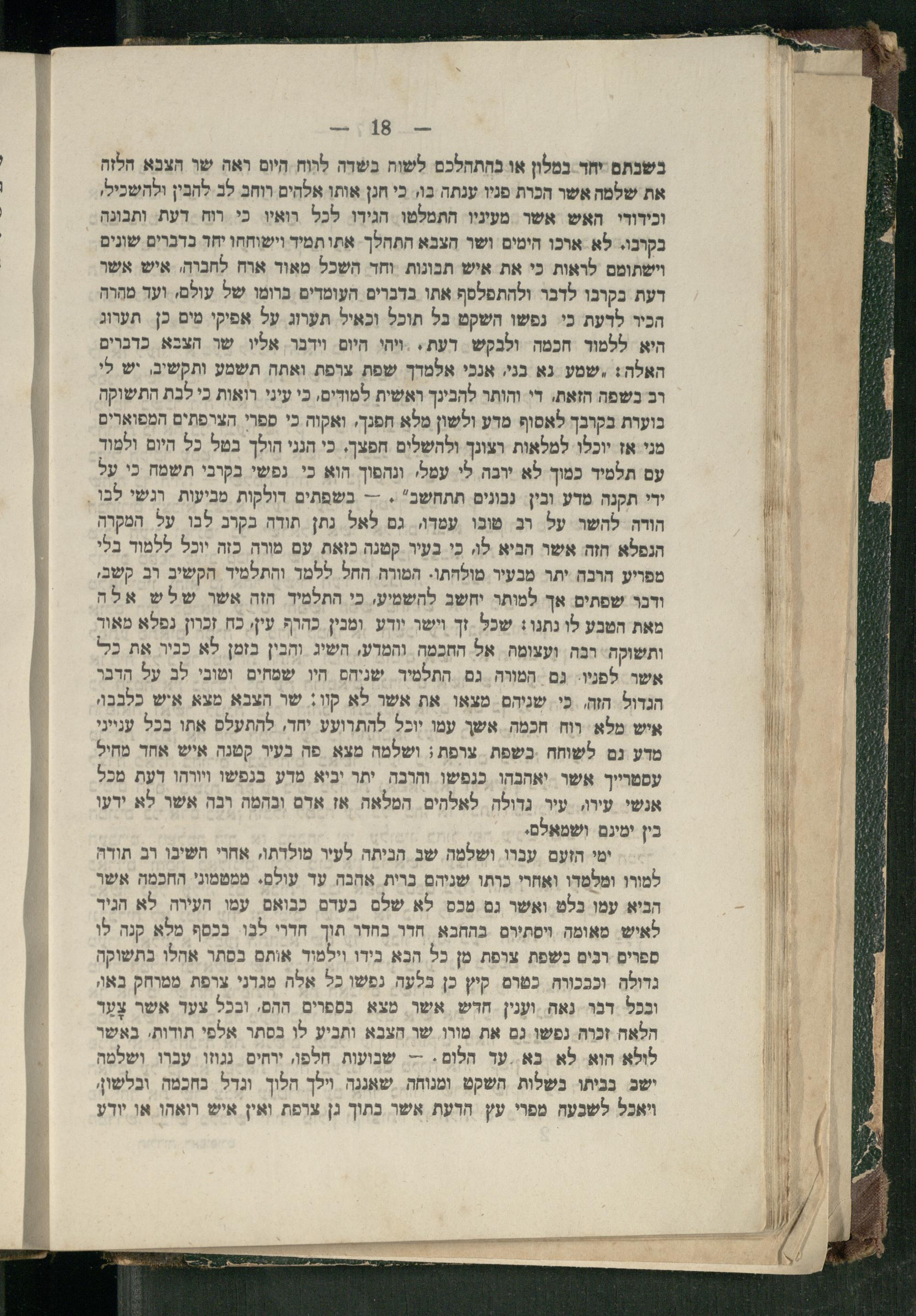 בשכתם יחד במלון או בהתהלכם לשות בשדה לרוח היום ראה שר הצבא הלזה את שלמה אשר הכרת מניו ענתה בו, כי חנן אותו אלהים רוחב לב להבין ולהשכיל, וכידודי האש אשר מעיניו התמלטו הגירו לכל רואו כי רוח דעת ותבונה בקרכו. לא ארכו הימים ושר הצבא התחלך אתותמיר וישוחחו יחד כדברים שונים וישתומם לראות כי את איש תכונות וחד השכל מאוד ארח לחבוה, איש אשר דעת בקרבו לדבר ולהתפלסף אתו בדכרים העומדים ברומו של עולם, וער מהרה הכיר לדעת כי נפשו השקט בל תוכל וכאיל תערוג על אפיקי מים כן תערוג היא ללמור חכמה ולבקש דעת..ויהי היום וידבר. אליו שר הצבא כדבוים האלה: ,שמע נא בני. אנכי אלמדך שפת צרפת ואתה תשמע ותקשיב, יש לי רב בשפה הזאת, די והותר להבינך ראשית למודים, כי עיני רואות כי לבת התשוקה בוערת בקרבך לאסוף מדע ולשון מלא חפנך, ואקוה כי ספרי הצרפתים המפוארים מני אז יוכלו למלאות רצונך ולהשלים חפצך, כי הגני הולך בטל כל היום ולמוד עם תלמיד כמוך לא ירבה לי עמלי ונהפוך הוא כי. נפשי בקרבי תשמח כי על ירי תקנה מדע ובין נבוגים תתחשב".-- בשפתים רולקות מביעות. רגשי לבו, הורה להשר על וב טבו עמדו, גם לאל נתן תודה בקרב לבו על המקרה הנפלא חזה אשר הביא לו, כי בעיר קטנה כזאת עם מורה כזה יוכל ללמוד בלי מפריע הרבה יתר מבעיר מולחתו. המורה החל ללמד והתלמיד הקשיב רב קשב, ודכר שפתים אך למותר יחשב להשמיעי כי התלמיד הזה אשר שלש אלה מאת הטבע לו נתנו: שכל זך וישר יודע ומכין כהרף עין, כח זכרון נפלא מאור ותשוקה. רבה ועצומה. אל התכמה והמרע, השיג והבין בזמן לא כביר אֶת כל אשר לפנו. גם המוה גם התלמיד שניהם היו שמחים וטובי לב על הדבר הגדול הזה, כי שניהם מצאו את אשר לא קוו: שר הצבא מצא איש כלבבוי איש מלא רוח חכמה אשך עמו יוכל להתרועע יחד, להתעלם אתו בכל ענייני מדע נם לשוחח כשפת צרפת; ושלמה מצא פה בעיר קטנה איש אחד מחיל עסטרייך אשר יאהבהו כנפשו וחרכה יתר יביא מדע בגפשו ויורהו דעת מכל אנשי עירו, עיר נדולה לאלהים המלאה אז אדם ובהמה רבה אשר לא ירעו בין ימינם ושמאלם.