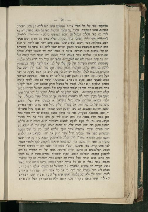 מלשקוד עוד על כל ספרי צרפת ואשכנז אשר באו לידו. בין המון הספרים השונים, אשר בשקידתו הרבה עד מהרה חליפות באו גם יצאו מתחת ידו, בא לידו. גם. ספר המלים הגדול מן החכם הצרפתי ביילע פזגגמסגוסום, 5'סועות) ("סגוונס סוס 9%פגם המדבר ברוח בקוות נפלא מאוד על אורות רבים אנשי השם מתולדות דברי הימים. ובשום שכל ובטוב טעם יראה שם לדעת, כי רבים מהם הגבוחים והנשאים בעיני ההמון וקדוש יאמר להם, אם נביאה כל מעשיהם פה עלי אדמות בכור הבחינה, נראה כי מתוהו המה יחד ומאפע פעלם, ואולם שם ובים וכן. שלמים אשר באמת כניר מצאה ידם ואשר הרבו עשות חיל היה עד עתה בטמון ולא יצא לאוביומם. הספר הזה עורר רוח חרש בלב שלמה, עשתונות חדשות ורעיונות אין קץ עלו על לבו ואש להבה גֶפֶחה בעצמותיו ללכת גם הוא בדרכי הצרפתי הלזה, לנסות את כחו ולבקר הדק היטב בכל הדברים הנוגעים לכלל תולרות ישואל בין טוב לרע: בין אמת לשקר, בין רבר הבל ורעות רוח אשר רק ההמון יאמין בו לדבר יש בו אמון וכמעשה הצרפתי הלזוה לאנשי השם מקרב ה עמים, כמתכונתו יעשה גם הוא, לבער קוצים משדה תולדות יש ראל. להסיר כל מכשול וחדק ואמונת שוא ותפל ולעבור ברוח משפט וברוח בער בין שפוני טמוני קדם וכל מעשה ישראל וגדוליהם מימי עולם ומשנים קדמוניות.-- עצור במלין פה לא אוכלו להעיר על דבר אחד אשר מצער וקל הערך ידמה לנו בואשית השקפה, אך רב וגדול מאוד בפעולתו עלי חלד. כקראנו תולדות אדם גדול בישואל או בעמים, איש נעלה ונשגב בדבר מה על כל בני דורו. אם משורר ומליץ גדול אשר כח בו לשיר בשירים ולחבר רעיונות נשגבים, אם בעל חשבון ותוכן מפואר, אם מבקר גדול אשר לו יר ושם במלאכת הבקורת. אזי עד מהרה נמצא בקורות ימי חייו מקרה אחד קטן אשר עליו נאמו, הוא הוא הביאו לידי כך, הוא עורר את רוח הזמרה בקרבו, הוא נתן לו מקום לבקש ולמצוא חשכונות רבים, וכהנה רבות, ולולא המקרה הקטן הזה שמו בתוהו עלה. זה שלמה האיש מקרה קרה לו וימצא בין המון ספוים שונים צופתים אשר שקד עליהם למען בין יבין דרכי השפה הצרפתית ספר אחד ממנקר גדול אשר הניע את רוחו. ובקראנו את תולרות החכם התוכן המפואר מוהו"ר חיים זעליג סלאנימסקי, נמצא כי רוקח אחר שכנו בהכירו כי שאר רוח להנער הזה וגם נפשו תתאוה להקשיב לקח וללמור חכמה, למד אותו קרוא ספר אשכנזי, ועפ"י מקרה היה הספר הזה-- ראשית לימודי חכמת האלגעבוא מן החכם הגדול איילער,.אשר על ידו התעורר גם הוא להעמיק בחכמה הנפלאה הואת, ובקרב שבועות אחרים השיב לו את הספר הזה כתוב פנים ואחור מכל עבריו עם הערות רבות ומחכמות גם על שגיאות הדפוס אשו נפלו בו גם על אודות הספר בעצמו, וכהנה וכהנה רבות מאור נמצא בקורות חיי אנשים מפוארים, גם בישראל גם בעמים, אולם המ קרים האלה ל א המה ומתוהו המה יחד. כי אל כל אשר היה שם רוח הא דם ללכתי שמה ילך ולא יסב בלכתו ואיש איש אל עבר פניו ילכו. רכרים כ א לה, אשר בשם מקרה נכנה אותם, הלא גם המה רק אצל א נ שים