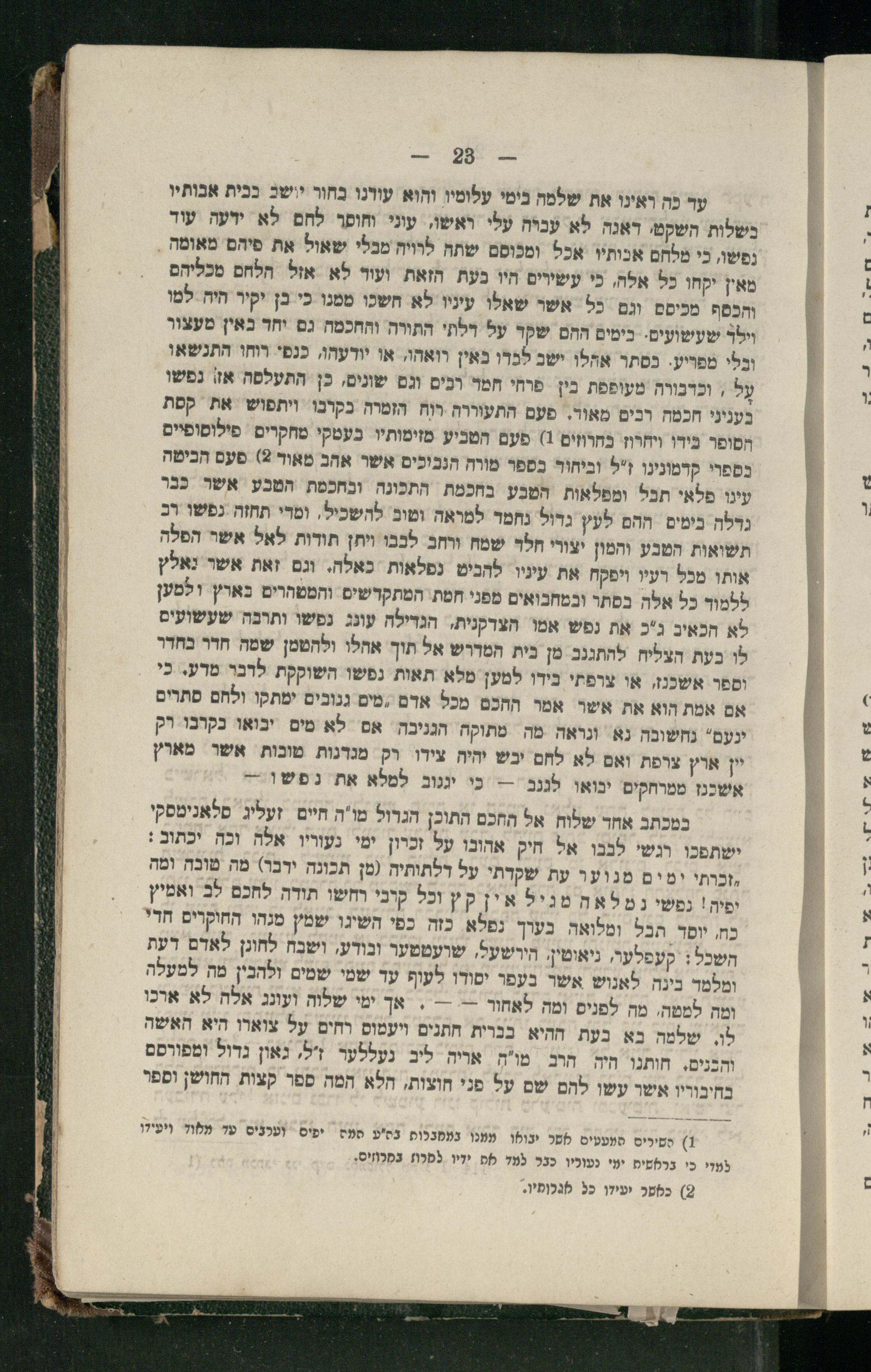 במכתב אחר שלוח. אל החכם התוכן הגרול מו"ה חיים. זעליג. סלאנימסקי ישתפכו רגשי לכבו אל חיק אהובו על זכרון ימי נעוויו אלה וכה יכתוב: זכותי ימים מנוער עת שקדתי על דלתותיה(מן תכונה ירבר) מה טובה ומה יפיה! נפשי נ מלאה מגיל איןקץ וכל קרבי רחשו תודה לחכם לב ואמיץ כח, יוסד. הבל ומלואה בערך נפלא כזה כפי השיגו שמץ מגהו החוקרים חרי השכל: קעפלער, ניאוטין. הירשעל, שרעמטער ובודע, ושבח לחונן לאדם דעת ומלמד בינה. לאנוש אשר בעפר יסודו לעוף ער שמי שמים ולהבין מה למעלה ומה למטת, מה לפנים ומה לאחור====. אך ימי שלוה ועונג אלה לא ארכו לו. שלמה בא בעת ההיא בכרית חתגים ויעמוס רחים על צוארו היא האשה והכנים. חותנו. היה הרב| מו"ה. אריה ליב נעללער. ז'ל, גאון גדול ומפורסם בחיבוריו אשר עשו להם שם על פני חוצות, הלא המה ספר קצות החושן וספר 0 הסיכיס סעטעטיס ספל ינוסו ממנו בעמבכום נת'ע סמס יפיס ועכניס עד מלוד ויפידו כמדי כי ברססים ימי נטוכיו. כנל למל פס ידיו פמרת במלוזיס,