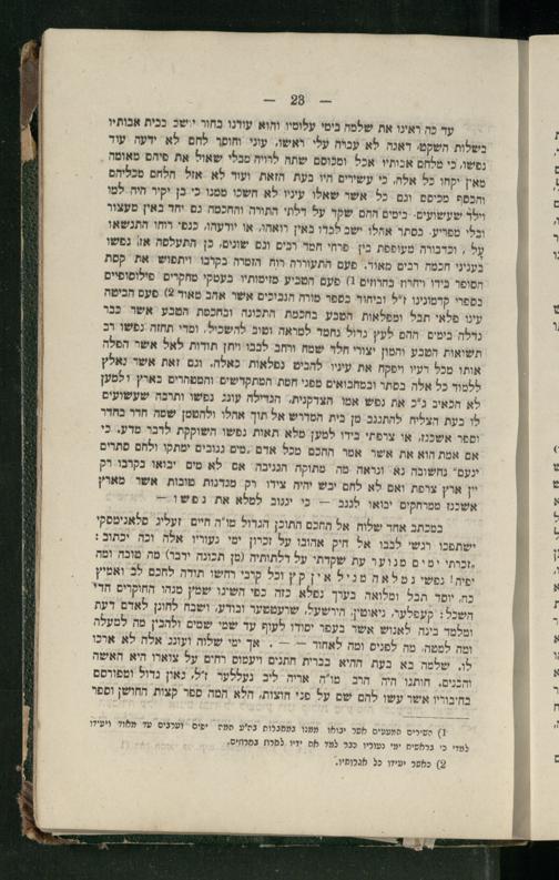 ער כה ראינו את שלמה בימי עלומיו והוא עורנו בחור יישב בבית אבותיו בשלות השקט, ראנה לא ענוה עלי ואשו, עני וחופר לתם לא ידעה עוד נפשו, בי מלחם אכותיו אכל ומכוסם שתה לרויה מבלי שאול את פיהם מאומה. מאין יקחו כל אלח, כי עשירים היו בעת הזאת ועור לא אזל הלחם מכליהם והכסף מכיסם וגם. כל אשר שאלו עיניו לא חשכו ממנו כי בן יקיר היח למו וילד שעשועים. בימים התם שקד על דלתי התורה והחכמה גם יחד באין מעצור וכלי מפריע. בסתר אחלו ישב לברו באין רואהו, או יודעהו, כנפי רוחו התנשאו עֶל, וכדבורה מעופפת בין. פרחי חמר רכים וגם שונים, כן התעלסה אזו נפשו בעניני חכמה רבים מאור. פעם התעוורה ווה הזמיה בקרבו ויתפוש את קסת הסופר בידו ויחו בחרוזים 1) פעם הטכיע מזימותיו. בעטקי מחקרים. פילופופיים בספרי קדמונינו ז"ל וביחור בספר מורה הנבוכים אשר אהב מאור%) פעם הבימה עינו פלאי תכל ומפלאות הטבע בחכמת התכונה ובחכמת הטבע אשר כבר נדלה בימים חהם לעץ גרול נחמר למראה וטוב להשכיל, ומרי תחזה נפשו רב תשואות הטבע והמון יצורי חלר שמח ורחב לכבו ויתן תודות לאל אשר הפלה אותו מכל רעיו ויפקח את עיניו. להביט נפלאות כאלה. וגם זאת אשר נאלץ ללמור כל אלה בסתר ובמחבואים מפני חמת. המתקרשים והמטהרים בארץ ולמען לא הכאיב ג'כ את נפש אמו הצרקנית, הגדילה עונג נפשו ותרכה שעשועים לו בעת הצליח. להתגנב מן בית המררש אל תוך אהלו ולהטמן שמה חדר בחדר וספר אשכנז, או צרפתי בידו למען מלא תאות נפשו השוקקת לרבר מרע. כ' אם אמת הוא את אשר. אמר התכם מכל אדם ,מים גגובים ימתקו ולחם סתרים ינעם' נחשובה נא ונראה מה מתוקה הגניבה אם לא מים יבואו בקרבו רק ין ארץ צרפת ואם לא לחם יבש יהיה צידו רק מגדנות מובות אשר מארץ