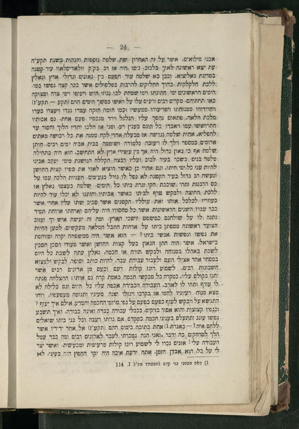 אבני מילואים, אשר על זה.האחרון. שת. שלמה נוספות והגהות. בשנת תקע'ה עת יצַא ראשונה לאוך בלבוב. גיסו.חיה אז רב בק"ק וולאריסלאוו עיר-קטגה במרינת גאלוציא. ובכן כא. שלמה עוד. הפעם בין-גאוגים ארץ ונאלץ ללכת בהרך החלוקים. להרבות. בפלפולים. אשר ככר קצה נפשו במו. הימים הראשונים ימי. חתוגתו וימי שמחת לבו נגוזו.חיש ויעופו וימי. צרה ומצוקה באו תחתיהם. מקרים רבים ורעים עלו על ראשו במשך.הימים.ההם(תקע-= תקע"ז) ויחרידוהו ממנוחתו ויפריעוהו. ממעשיו וְכְמוּ חומה חזקה עמדו נגדו ויעצרו בעדו מלכת הלאה. פתאום נהפך עליו הגלגל וירר מנכסיו פעם אחת. גם אבותיו חתרוששו עמו וואבדו כל הוגם בענין רעי ומנ'.אז הלכו יחדיו הלוך וחסור ער להפליא, אחות שלמה נגרשה אז מבעלה אחרי לקח. ממנה את כל רכושה מאתים ארומים. כמספר וילך לו ויעזבה גלמורה ושוממה. בבית אביה ימים רבים.. חותן שלמה אף כי גאון נדול היה. אך בין עשירי ארץ.לא התחשב. הוא היה בתחילה מלמר בנים. בשכר בעיר ועליו. רבצה.הקללה הנושנת מימי. יעקב אבינו לתיות עני כל ימי חיתו. וגם אחרי כן כאשר הוציא לאור את ספרו קצות החושן ונעשה רב גדול בעיר הקטגה לא נפל לו גוול בנעימים.. העניות הלכה עמו על כס הרֶבנות ותהי.שוכבת חקו וגרת ביתו כל ,הימים. שלמה בעצמו נאלץ או ללכת החוצה ולבקש טרף לביתו. באשר אכותיו וחותנו. לא יכלו עור להיות בעוזריו ולכלכל:אותו ואת הקטנים אשר סביב שתו עליו אחרי אשר כבר עברו השנים הראשונות אשר כל מחסורו היה עליחם וארחתו ארוחת תמיד נתנה:לו על שולחנם כמשפט\יושבי הארץ. ומה זה יעשה איש רך ועזוב הצועד ראשונה ממפתן ביתו על ארחות התבל המלאה מעקשים, למען החיות את נפשו ונפשות אנשי בותו?-- הוא אשר היה ממשפחה יקרה ומיוחסת בישראל, אשר.היה חתן הגאון בעל קצות החושן ואשר מעודו הסכן הסכין לשבת באהלו במנוחה ולבקש תורה או חכמהי נאלץ עתה לשבת כל היום במסחר אחד אצילי העָם ולעכוד עבודת עבד, להיות כותב. וסופר, לבקש ולמצוא חשבונות רְבים, לשמוע רוגז קולות ועם וכעם מן אדנים רנים אשר יתנו בקולם עליו. כמקרה כל מכקשי חבמה באמת קרה גם. אותו: ההצלחה פנתה לו עורף ותהי לו לאויב. העבורה הכבידה אכפה עליו כל היום וּנם בלילה לא מצא מנוח. רעיוניו. לחמו. אז בקרבו ויגזֶלו. שנה. מעיניו ותגומה מעפעפיו.. רוחו התנשא על ויבקש לעוף כפעם בפעם על גי מרומי החכמה והמדע, אולם איך יעוף? וכנפיו קצוצות והוא אפור בזיקים, בכבלי עבורה כבדה וְאינה כבורה, ואיך תשבע נפשו עונג ותתעלס בעניני חכמה כמקדם.אם גויתו רעבה ובל בני ביתו שואלים