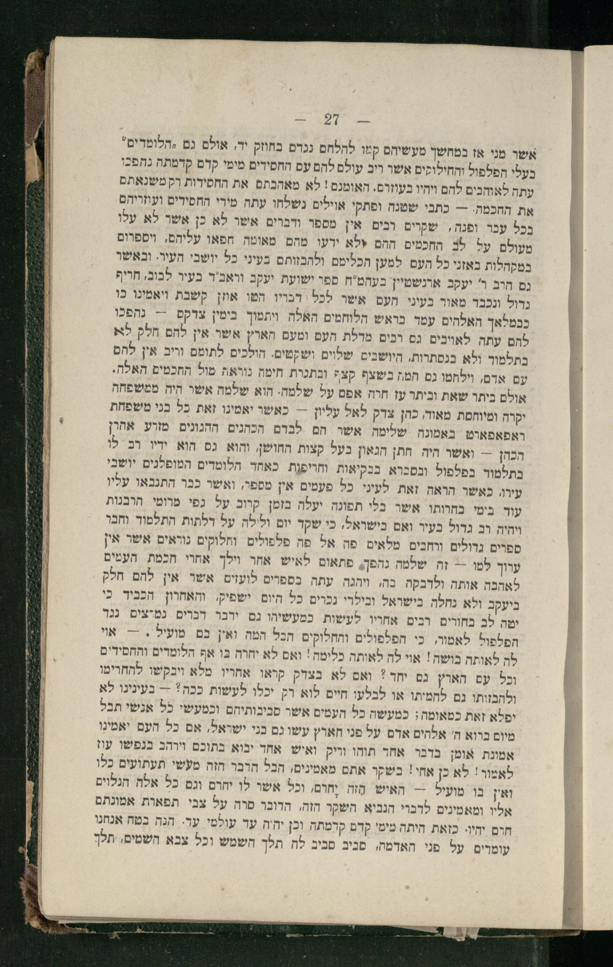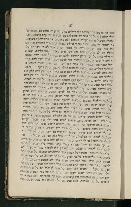 אשר מני אז במחשך מעשיהם קמו להלחם נגדם בחוזק יד, אולם גם ,הלומדים" בעלי הפלפול והחילוקים אשר ריב עולם להם עם החסידים מימי קדם קדמתה נהפ=. עתה לאוחבים להם ויהיו בעוזרם. האומנם! לא מאהבתם את החסידות רק משנאתם את החכמה.-- כתבי שטנה ופתקי אוילים נשלחו עתה מירי החסידים ועוזריהם בכל עבר ופנה, שקרים ובים אין מספר ודברים אשר לא כן אשר לא עלו מעולם על 0ב התכמים ההם טלא ירעו מהם מאומה. חפאו עליהם, ויספרום במקהלות באזני כל העם למען הכלימם ולהבזותם בעיני כל יושבי העיר. ובאשר גם הרב ר' יעקב ארנשמיין בעהמ"ח ספר ישועת יעקב וראב'ר בעיר לבוב, חריף נדול ונכבד מאור בעיני חעם אשר לכל דבויו הטו אוזן קשבת ויאמינו כו כבמלאך האלהים עמר בואש הלוחמים האלה ויתמוך בימין צדקם-- נהפכו להם עתה לאויבים גם רבים מרלת העם ומעם הארץ אשר אין להם חלק לא בתלמוך ולא בנסתרות. היושבים שלוים ושקטים. הולכים לתומם וריב אין להם עם ארם, וילחמו גם המז בשצף קצ5 ובתגרת חימה נוראה מול החכמים האלה. אולם ביתר שאת וביתר עז חרה אפם על שלמה. הוא שלמה אשר היה ממשפחה יקרה ומיוחסת מאור, כהן צרק לאל עליון-- כאשר יאמינו זאת כל בני משפחת ראפאפאוט באמנה שלימה אשר הם לברם הכהנים ההגונים מזרע אהרן הכהן-= ואשר היה חתן הגאון בעל קצות החושן והוא גם הוא ידו רב לו בתלמור בפלפול ובסברא בנקיאות וחריפות. כאחד הלומדים המופלנים יושבי עירו, כאשר הראה זאת לעיני. כל פעמים אין מספר, ואשר כבר התנבאו עליו עוד בימי בחרותו. אשר בלי תפונה יעלה בזמן קרוב על גפי מרומי. הרבנות ויהיה רב גדול בעיר ואם בישראל, בי שקד יום וללה על דלתות התלמור וחבר ספרים גדולים ורחבים. מלאים פה אל פה פלפולים וחלוקים נוואים אשר אין ערוך למו-- זה שלמה נהפך פתאום לאיש אחר וילך אחוי הכמת העמים לאהבה אותה ולדבקה בה, ויהגה עתה כספרים לועזים אשו אין להם חלק ביעקב ולא נחלה בישראל ובילרי נכרים כל היום ישפיק, והאחוון הכביר כי יטה לב בחורים. רבים אחויו לעשות כמעשיהו גם ירבר דברים. נמיצים נגד הפלפול לאמור, כי הפלפולים והחלוקים הבל המה ואין בם מועיל.-- אוי לה לאותה בושה! אוי לה לאותה כלימה! ואם לא יחוה בו אף הלומדים והתסידים וכל עם הארץ נם יחד? ואם לא בצדק קראו אחריו מלא ויכקשו להחרימו ולתבזותו גם לחמיתו או לבלעו חיים לוא רק יכלו לעשות ככה*= בעינינו לא יפלא זאת כמאומה; במעשה כל העמים אשר סביבותיתם וכמעשי כל אנשי תבל מיום ברוא ה' אלהים אדם על פני חארץ עשו גם בני ישראל, אם כל העם יאמינו אמונת אומן בדבר אחד תוהו וריק ואיש אחד ינוא בתוכם וירהב בנפשו עף לאמור! לא כן אחי! בשקר אתם מאמינים, הבל הרבר חזה מעשי תעתועים כלו ואין בו מועיל- האיש הזה יֶחרם, וכל אשו לו יחרם וגם כל אלה הנלוים אליו ומאמינים לדבוי הנביא. השקר הזה, הדובר סרה על צבי תפאות אמונתם חום יהיו. כזאת היתה מימי קדם קרמתה וכן יחה ער עולמי ער. הגה בטח אגחנו עומרים על פני האדמה, סיב סביב לה תלך השמש וכל צבא השמים, תלך