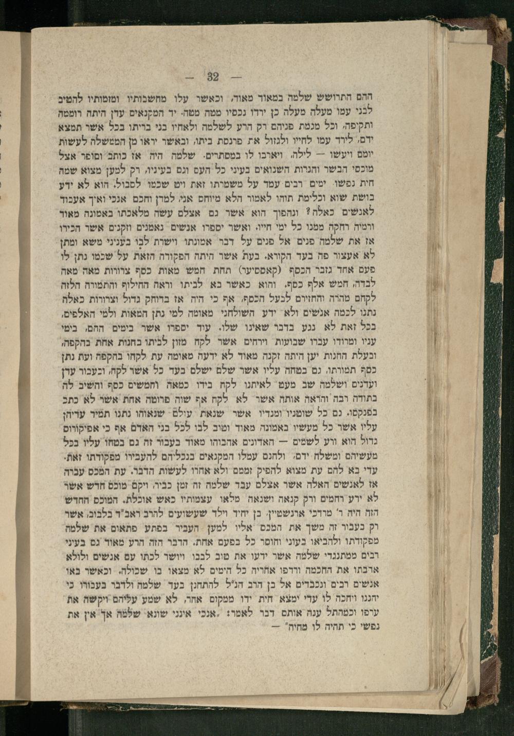 ההם התרושש שלמה במאוד מאוד, וכאשר עלו מחשבותיו ומזמותיו להמיב לבני עמו מעלה מעלה כן ירדו נכסיו ממה מטה. יר המקנאים ערן היתה רוממה ותקיפה, וכל מגמת פניהם רק הרע לשלמה ולאחיו בני בריתו בכל אשר תמצא ידם, לירד עמו לחייו ולגזול את פונסת ביתו, ובאשר יראו מן הממשלה לעשות יומם ויעשו-- לילה, ויארבו לו במסתרים. שלמה היה אז כותב וםופר אצל מוכסי הבשר והגרות השנואים בעיני כל העם וגם בעיניו, רק למען מצוא שמה חית נפשו. ימים רבים עמד על משמרתו זאת ויש שכמו לסבול. הוא לא ירע בושת שוא וכלימת תוהו לאמור הלא מיוחס אני. למרן וחכם. אנכי ואיך אעכור לאנשים כאלה? ונהפוך הוא אשר גם אצלם עשה מלאכתו באמונה מאור ורמיה רחקה ממנו כל ימי חייו. ואשר יספרו אנשים נאמנים וזקנים אשר הכירו אז את שלמה פנים אל פנים על דבר אמונתו וישרת לבו בעניני משא ומתן לא אעצור פה בעד הקורא. בעת אשר היתה הפקורה הזאת על שכמו נתן לו פעם אחד גזבר הכסף(קאמסיעו) תחת חמש מאות כסף צרווות מאה מאה לבדה, חמש אלף כסף. והוא כאשר בא לניתו וראה החילוף והתמורה הלזה לקחם מהרה והחזירם לכעל הכסף,. אף כי היה אז בדוחק גדול וצרורות כאלה נתנו לכמה אנשים ולא ידע השולחני מאומה למי נתן המאות ולמי האלפים, בכל זאת לא נגע בדבר שאינו שלו. עוד יספרו אשר בימים ההםו בימי עניו ומרודו עברו שבועות וירחים אשר לקח מוון לביתו בחנות אחת בהקפה, ובעלת החנות יען היתה זקנה מאוד לא ידעה מאומה עת לקחו בהקפה ועת נת] כסף תמורתו, גם בטחה עליו אשר שלם ישלם בעד כל אשר לקח, וכעבור ערן ועדנים ושלמה שב מעט לאיתנו לקח בידו כמאה וחמשים כסף והשיב לה בתודה רבה והואה אותה אשו לא לקח אף שוה פרוטה אחת אשר לא כתכ בפנקסו. נם כל שוטניו ומנדיו אשר שנאת עולם שנאוהו נתנו תמיר עריהן עליו אשר כל מעשיו באמונה מאוד ומוב לבו לכל בני האדם אף כי אפיקורוס גדול הוא ווע לשמים-- האדונים אהבוהו מאוד בעבור זה גם בטחו עליו בכל מעשיהם ומשלח. ידם, ולחגם עמלו המקנאים בנכליהם להעבירו מפקודתו זאת. עדי בא להם עת מצוא להפיק זממם ולא אחרו לעשות הדבר. עת המכס עברה אז לאנשים האלה אשר אצלם עבר שלמה זה זמן כביר, ויקם מוכם חדרש אשר לא ירע וחמים ורק קנאה ושנאה מלאו עצמותיו כאש אוכלת. המוכם החדש הזה היה ר' מרדכי ארנשטיין: כן יחיד וילד שעשועים להרב ראב"ד בלבוב, אשר רק בעבור זה משך את המכם אליו למען הענביר בפתע פתאום את שלמה מפקודתו ולהביאו בעוני וחוסר כל בפעם אחת. הדבר הזה הרע מאוד גם בעיני רבים ממתנגדי שלמה אשר ירעו את מוב לבבו ויושר לכתו עם אנשים ולולא ארבתו את החכמה וררפו אחריה כל הימים לא מצאו בו שכולה. וכאשר באו אנשים רבים ונכבדים אל בן הרב הנ"ל להתחנן בעד שלמה ולדבר בעבורו כי יחגנו ויחכה לו עדי ימצא חית ידו ממקום אחר, לא שמע עליהם ויקשה את ערפו וכמהתל ענה אותם דבר לאמר: ,אנכי אינני שונא: שלמה אך אין את נפשי כי תהיה לו מחיה"-