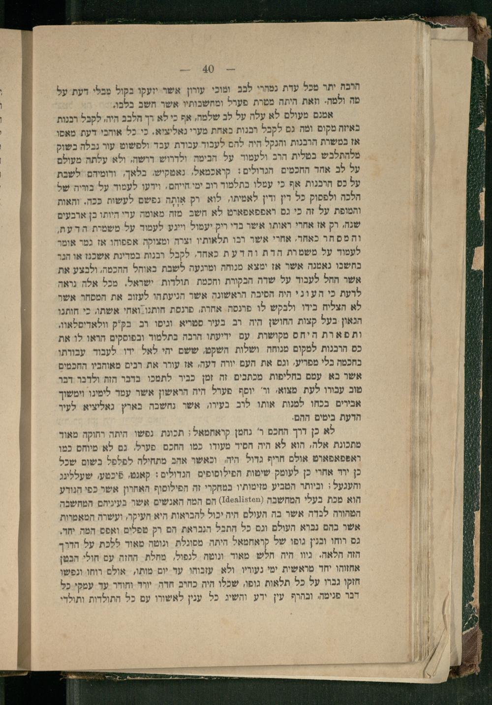 לא כן דרך החכם ר' נחמן קראחמאל: תכונת נפשו היתה רחוקה מאור מתכונת אלה, הוא לא היה חסיד מעודו כמו החכם פעול, נם לא מיוחס כמו ראפפאפארט אולם חריף גדול היה וכאשר אהב מתחילה לפלפל בשום שכל כן ירד אחרי כן לעומק שיטות הפילוסופים. הגדולים: קאנמ, פיכטע, שעללינג והעגעל: וכיותר הטביע מזימותיו במחקרי זה הפילוסוף האחרון אשר כפי הגורע הוא מכת בעלי המחשבה(1854135%%) הם המה האנשים אשר בעיניהם המחשבה הטהורה לבדה אשר בה העולם היה יכול להבראות היא העיקר, ועשרה המאמרות אשר בהם נברא העולם וגם כל התבל הנבראת הם רק מפלים ואפס המה יחר. גם רוחו ובנין גוםו של קראחמאל היתה מפונלת ונוטה מאוד ללכת על הרוך הזה הלאה. גיוו היה חלש מאוד וושה לנפול, מחלת החזה עם חולי הבטן אחזוהו יחד מראשית ימי נעוריו. ולא עזכוהו עד יום מותו, אולם רוחו ונפשו חזקו גברו על כל תלאות גופו, שכלו היה כחוב חדה יורד וחודר ער עמקי כל דבר פנימה, ובהרף עין ירע והשיג כל ענין לאשורו עם כל התולדות ותולדי