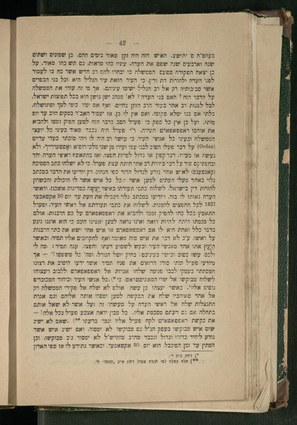 בעהמ"ח ס' יהושע. האיש הזה חיה זקן מאוד בימים ההם, כן שמונים ושתים שנה וארבעים שנה שפט את העדה. עיניו כהו מראות, גם תש כחו מאוד. על כן יצאה הפקודה מטעם. הממשלה כי יבחרו להמ רב חרש אשר כח בו לעמור לפני העדה ולהורות דת ודין, כי העיר הזאת עיר הגליל היא וכל בני הכפרים אשר סביבותיה רק אל רב הגליל ישימו עיניהם. אך מי זה עורר את הממשלה על הדבר הזה האם בני העדה? לא! מנהג ישן נושן הוא בכל תפוצות ישראל, לבל למגות רב אחר בעור הרב הזקן נחיים, ואף אם ימיו. כימי למך ומתושלח, בלתי אם בנו ימלא מקומו, ואם אין לו בן, אז יעמוד האב"ר במקום הרב עד יום מותו. ועל כן אץ כל ספק כי פעול הסב בדבר הזה למען הפיק זממו ולהביא את אוהבו ראפפאפארם העירה. ר"י פערל היה נככד. מאוד בעיני כל יועצי וסמשלה ובעיני כל אנשי העיר, כי עושר רב היה לו ויהי מוכתר בעדי עדיים (0+48) על דבר פעלו הטוב לכני עמו ועירו מן שני מלכי רוסיא ואָסטעררייך, ולא נעשה אז בעידו, דבר קטון או גדול למרות חפצו, ואז בהתאסף ראשי העדה יחד ובהמתיקם פוד על דבר בתירת רב אחר היתה עצת פערל. כי לא ישלחו כתב הסמיכח (קאנסענס) לאיש אחר נורע לגדול הדור כפי הנהוג. רק יודיעו את הרבר במכתב גלוי באחד מעלי העתים למען אשר יוכל כל איש אשר לו היכולת והכשרון להורות דין בישראל, לשלוח כתכי תעורתו כאשר יעַשָה במדינות אשכנן, וראשי העדה נאותו לו בזה, ויודיעו במכתב גלוי ויגבילו את העת עד יום 90 אקטאבער 7 לכל החפצים להמנות, לשלוח את כתבי תעודתם אל ראשי העיר. ופערל התאמץ בכל כחו להפיק זממו ולהניא את ראפפאפארט על כס הרבנות, אולם כל מגמתו היתה להיות רואה ואינו נראה למען יאמינו חעם כי הוא איננו נונע בדבר כלל ואחת היא לו אם ראפפאפארט או איש אחר ישא את כתר הרבנות על ראשו, ע'כ לא דבר את איש מזה מאומה ואף להקרובים אליו תמיר; וכאשר וְעַץ אתו אחד מאנשי העיר ובקש לשמוע דעתו וחפצו, ענה תמיד: ימה לי ולכם. עשו כטוב וכישר בעיניכם: בחיק יוטל הגורל, ומה' כל משפטו!"-- אך מיודעי פערל ומתי סורו הרואים את פניו תמיד אשר ידעו היטיב את רצונו המסתתר בעמקי לכבו פנימה שלחו אגרות אל ראפפאפארם ללבוב ויעצוהו לשלוח מבוקשו אל שרי המא גיסטראט. כי*) ,כל אנשי העיר וביחוד המכובדים נוטים אליו". כאשי יעצהו כן עשה אולם לא שלח אל פקירי הממשלה רק אל אחד מאוהביו שלח את הכקשה למען ימסרו אותה אליהם וגם אגרת התנצלות שלח אל ראשי העדה על מעשהו זה ועל אשר לא שאל אותם בתחלה אם גם דעתם מסכמת אליו.. כל מבין יראה אצבע פערל בכל אלה!-את בקשת ראפפאםארט לקח פעול אליו וגמר בדעתו'*).שאם לא ישיג שום איש מבוקשו בעסק הנ"ל נם מבוקשו לא ימסור, ואם ישיג איש אשר נודע ליחיד כדורו וגדול ונכבד. מהרב מוהרש"ל לא מסור ג'כ מבוקשה וכן המתין עד זמן המוגבל, הוא יום-%0 אקטאבעו, וכאשר נתידע לו אז מפי האדון