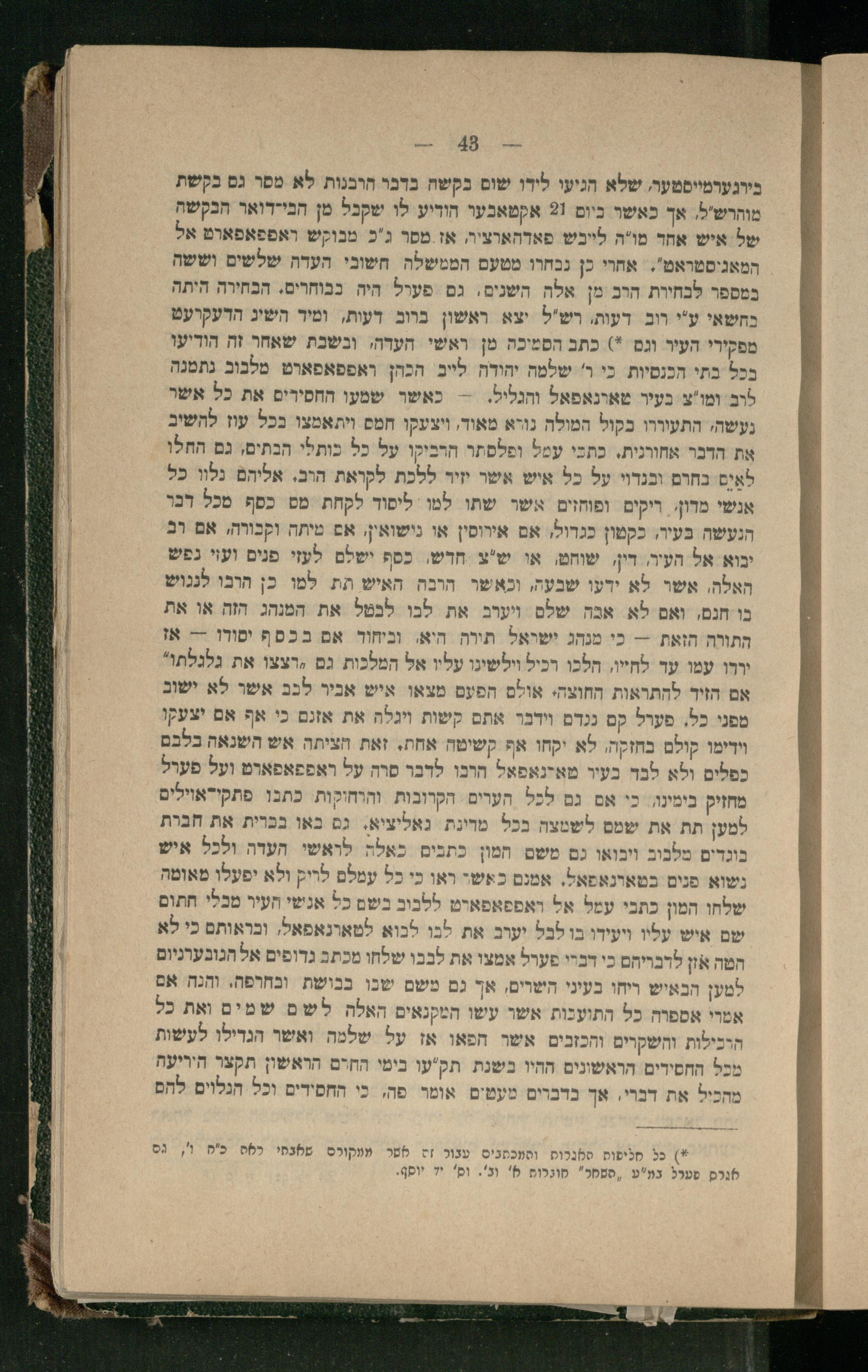 בירגערמייסטער, שלא הגיעי לידו שום בקשה בדבר הרבנות לא מסר גם בקשת מוהרש"ל, אך כאשר ביום 91 אקטאַבער הוריע לו שקבל מן הבי"רואר הבקשה של איש אחר מו"ה לייבש פאדהארציר, אז מסר ג"כ. מנוקש ראפפאפארט אל המאגיסטראט".. אחרי כן גבחרו מטעם הממשלה חשובי העדה שלשים וששה במספר לבחירת הרב מן אלה השנים. גם פערל היה כבוחרים. הכחירה היתה כחשאי ע"י רוב דעות. רש"ל יצא ראשון ברוב דעות, ומיר השיג הדעקרעם מפקירי העיר וגם*) כתב הסמיכה מן ראשי העדהי ובשבת שאחר זה הודיעו בכל בתי הכנסיות. כי ר' שלמה יהודח לייב הכהן ראפפאפארט מלבוב נתמנה לוב ומו"צ בעיר שאונאפאל והגליל.- כאשר שמעו החסירים את כל אשר נעשהי התעוררו בקול המולה נוא מאוד, ויצעקו חמס ויתאמצו בכל עוז להשיב את הדבר אחורנית. כתכי עמל ופלסתר הרביקו על כל כותלי הבתים, גם החלו לאָים בחרם ובנדוי על כל איש אשר יזיר ללכת לקואת הוב. אליהם נלוו כל אנשי מדון:. ריקים. ופוחזים. אשר שתו למו ליסוד לקחת מס כסף מכל רבר הנעשה בעיר, כקטון כגדול, אם אירוסין או נישואין, אם מיתה וקבורה, אם רב יכוא אל העיר, דין, שוחט, או ש"צ חרש, כסף ישלם לעזי פנים ועוי נפש האלה, אשר לא ידעו שבעה, וכאשר הרבה האיש תת למו כן הרבו לננוש בו חנם, ואם לא אנה שלם ויערב את לבו לבטל את המנהג הזה או את התורה הזאת-- כי מנהג ישראל תורה היא. וביחוד אם בכסף יסודו-- אז ירדו עמו עד לחייו, הלכו רכיל וילשינו עליו אל המלכות גם;רצו את גלגלתו" אם הזיד להתראות החוצה. אולם הפעם מצאו איש אביר לבב אשר לא ישוב מפני כל. פערל קם ננדם וידבר אתם קשות ויגלה את אזנם כי אף אם יצעקו וידימו קולם בחזקה. לא יקחו אף קשיטה אחת, זאת חציתה אש השנאה בלבם כפלים ולא לבד בעיר מאדנאפאל הרכו. לרבר סרה על ראפפאפארט ועל פערל מחזיק בימינג. כי אם גם לכל הערים הקרובות והוחוקות כתבו פתקידאוילים למען תת את שמם לשמצה בכל מרינת גאליציא. גם באו בברית את חברת בוגדים מלבוב ויבואו גם משם תמון כתבים כאלה לראשי העדה ולכל איש נשוא פנים בטארנאפאל. אמנם כאשי ראו כי כל עמלם לריק ולא יפעלו מאומה שלחו המון כתבי עמל אל ואפפאפארט ללכוב בשם כל אנשי העיר מכלי חתום שם איש עליו ויעידו בו לבל יערב את לבו לבוא למארנאפאל, ובראותם כי לא הטה אזן לדבריהם כי דברי פערל אמצו את לבכו שלחו מכתב גדופים אל הגובערניום למען הבאיש ריחו בעיני השרים, אך גם משם שכו בבושת ובחרפה. והנה אם אמרי אספוה כל התועכות אשר עשו המקנאים האלה לשם שמים ואת כל הרכילות וחשקרים והכזבים אשר הפאו אז על שלמה ואשר הגדילו לעשות מכל החסידים הראשונים ההיו בשנת תק"עו בימי החים הראשון תקצר היריעת מהכיל את דברי. אך בדברים מעטים אומר. פה, כי החסידים וכל הגלוים להם