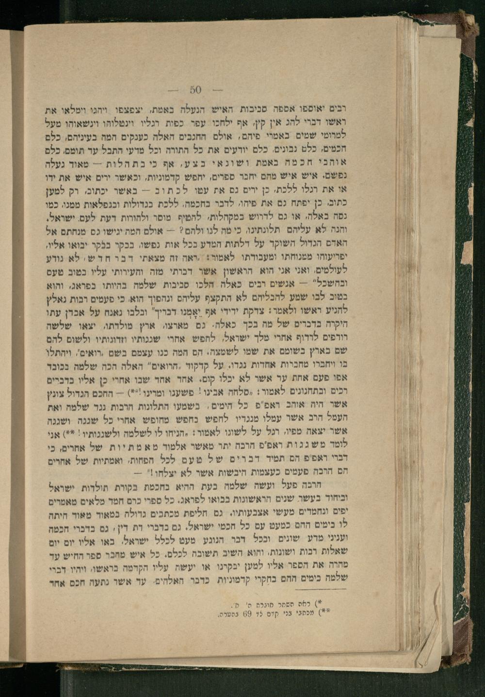 00-רבים יאוספו אספה סניבות האיש הנעלה באמת, יצפצפו ויהגו וימלאו את ראשו דברי להג אין קץ, אף ילחכו עפר כפות רגליו וינטלוהו וינשאוהו מעל למרומי שמים באמוי פיהם, אולם החנבים האלה כענקים המה בעיניהם, כלם הכמים, כלם נבונים. כלם יודעים את כל התורה וכל מדעי התבל ער תומם, כלם אוהבי חכמה באמת ושונאי בצע, אף כי בת הלות-- מאוד געלה נפשם, איש איש מהם יחכר ספרים, יחפש קדמוניות, וכאשר ירים איש את ידו או את רגלו ללכת, כן ירים גם את עטו לכתוב-- באשר יכתובי רק למען כתוב, כן יפתח גם את פיהו; לרבר בחכמה, ללכת בגדולות וכנפלאות ממנו. כמו נסה באלה, או גם לדרוש במקחלות; להטיף מוסר ולהורות דעת לעם. ישראל. וחנה לא עליהם תלונתינו, כי מה לנו ולהם?-- אולם המה יגישו גם מנחתם אל האדם הגדול השוקד על דלתות המדע ככל אות נפשו. בבקר בפקר יבואו אליו, יפריעוחו ממנוחתו ומעבודתו לאמור:.ראה זה מצאתי דבו חר ש. לא נורע לעולמים. ואני אני הוא הראשון אשר דכותי מזה והעירותי עליו בטוב טעס וכחשכל"-- אנשים רבים כאלה הלכו סביבות שלמה בהיותו בפראג, והוא בטוב לבו שמע להכליחם לא התקצף עליהם ונהפוך הוא, כי פעמים רבות גאלץ להניע ראשו ולאמר! צדקת ירידי אף יאָמְנו דבריך" ובלבו נאנח על אברן עתו היקרה בדברים של מה בכך כאלה. גם מארצו, ארץ מולדתו, יצאו שלשה רודפים לרדוף אחרי מלך ישראל, לחפש אחרי שנגותיו וזדונותיו ולשום להם שם בארץ בשומם את שמו לשמצה. הם המה כנו עצמם בשם.רואים', ויהתלר בו ויחברו מחברות אחדות נגדו. על קדקור ,הרואים" האלה הכה שלמה בכובד אפו פעם אחת עד אשר לא יכלו קום. אחד אחד שבו אחרי כן אליו בדברים רכים ובתחנונים לאמור: ,סלחה אבינו! פשענו ומרינו'"*)-- החכם הגדול צונץ אשר היה אוהב ואפ"פ כל הימים, בשמעו התלונות הרבות נגר שלמה ואת העמל הרב אשר עמלו מנגריו לחפש נחפש מחופש אחרי כל שגגה ושגנה אשר יצאה מפיו, רגל על לשונו לאמור: ,הניחו לו לשלמה ולשגגותיו!"*) אני לומד מש גנות ראפ'ם הרבה יתר מאשר אלמוד מא מתיות של אחרים, כי דברי ראפ'פ הם תמיד דבוים של טעם לכל הפחות, ואמתיות של אחרים חם הרכה פעמים כעצמות היבשות אשר לא יצלחו!"-הרכה פעל ועשה שלמה בעת ההיא בחכמת בקורת תולדות ישואל וביחוד בעשר שנים הראשונות בבואו לפראג. כל ספרי כרם חמד מלאים מאמרים יפים ונחמדים מעשי אצבעותיו. גם חליפת מכתבים גדולה במאוד מאור חיתה לו בימים החם כמעט עם כל חכמי ישראל. גם בדברי דת די גם בדכרי חכמה ועניני מדע שונים ובכל דבר הנוגע מעט לכלל ישראל, באו אליו יום יום שאלות רכות ושונות, והוא השיב תשוכה לכלם. כל איש מחבר ספר החיש עד מהרה את הספר אליו למען יבקרנו או יעשה עליו הקרמה בראשו, ויהיו דברי שלמה בימים ההם בחקרי קדמוניות כדבר האלהים. עד אשר נתעה חכם אחר